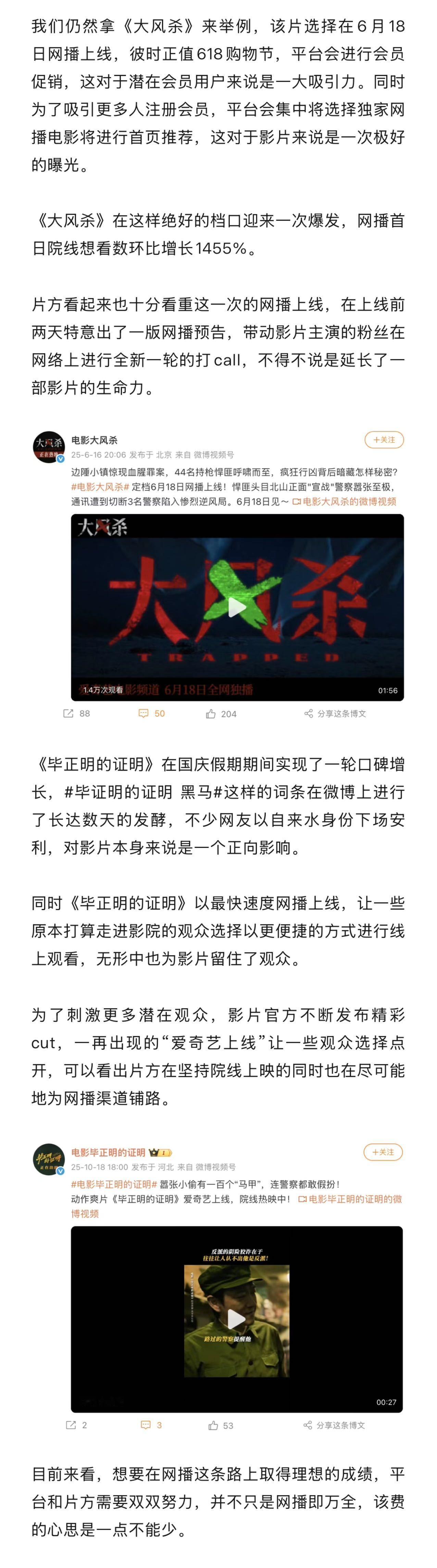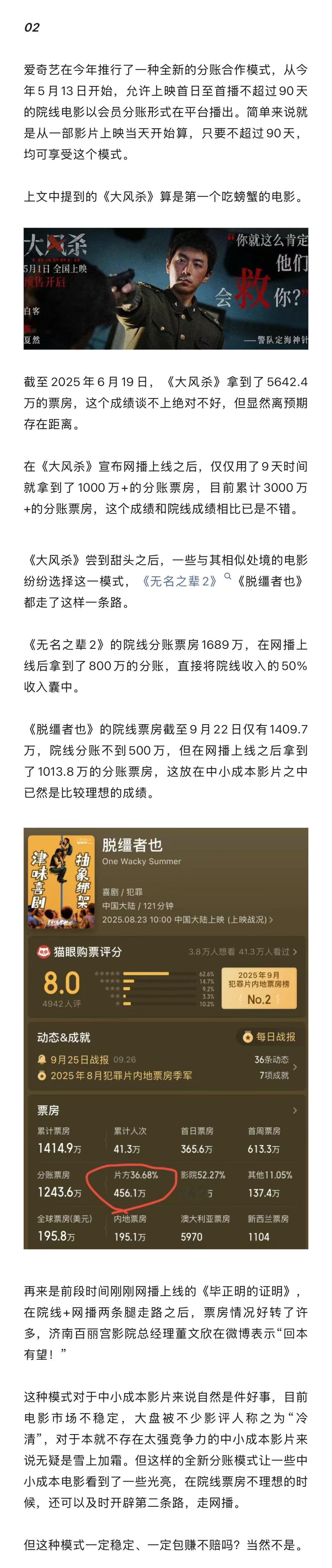 其背后是爱奇艺的全新玩法:按会员有效观看时长分账,最高可达3元/小时,《大风杀》《无名之辈2》都借此弥补了院线短板。但这模式并非万能,业内人士指出需影片有“网感”且积累了影院口碑,更有人担忧:观众选择权变多易中途弃片,平台未来或降低分账单价,这真能成为中小成本的稳定出路吗?