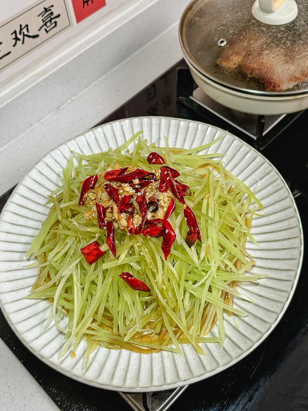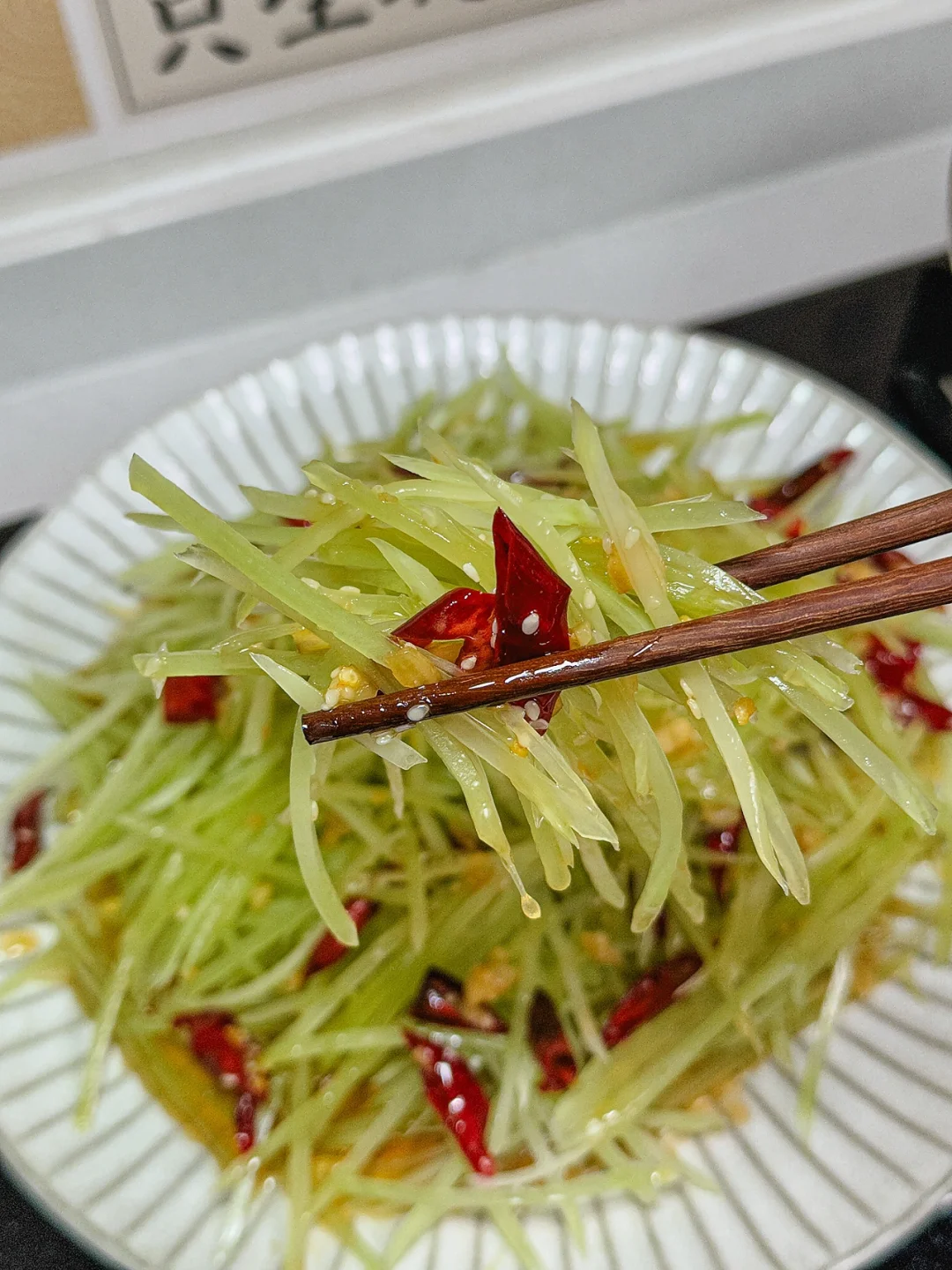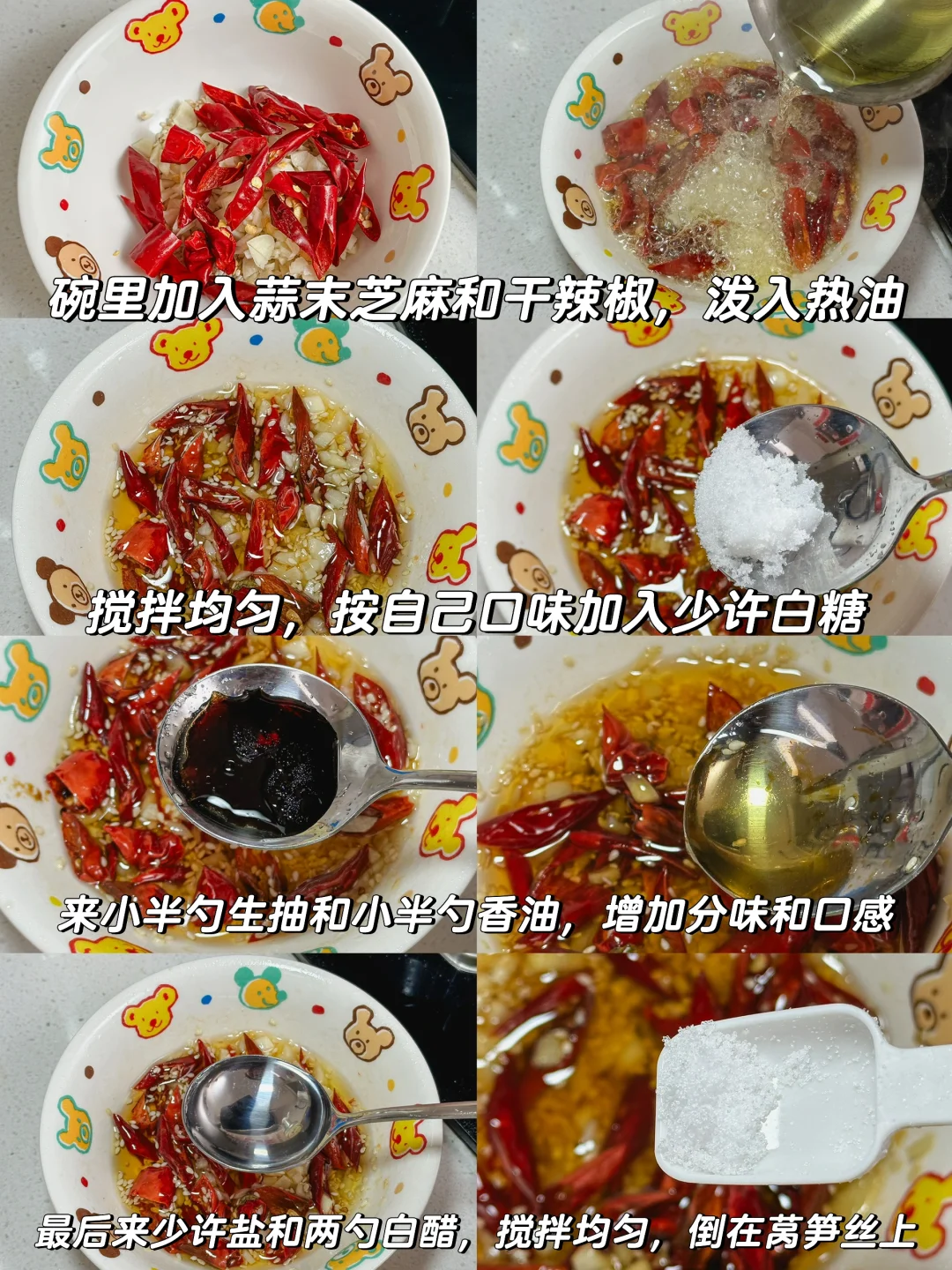 莴笋本来吃的就是一个爽脆的口感,所以前面不要用盐腌,腌过之后再倒入料汁莴笋会变得软趴趴,因为料汁里有盐相当于腌了两次,口感就没那么好了。