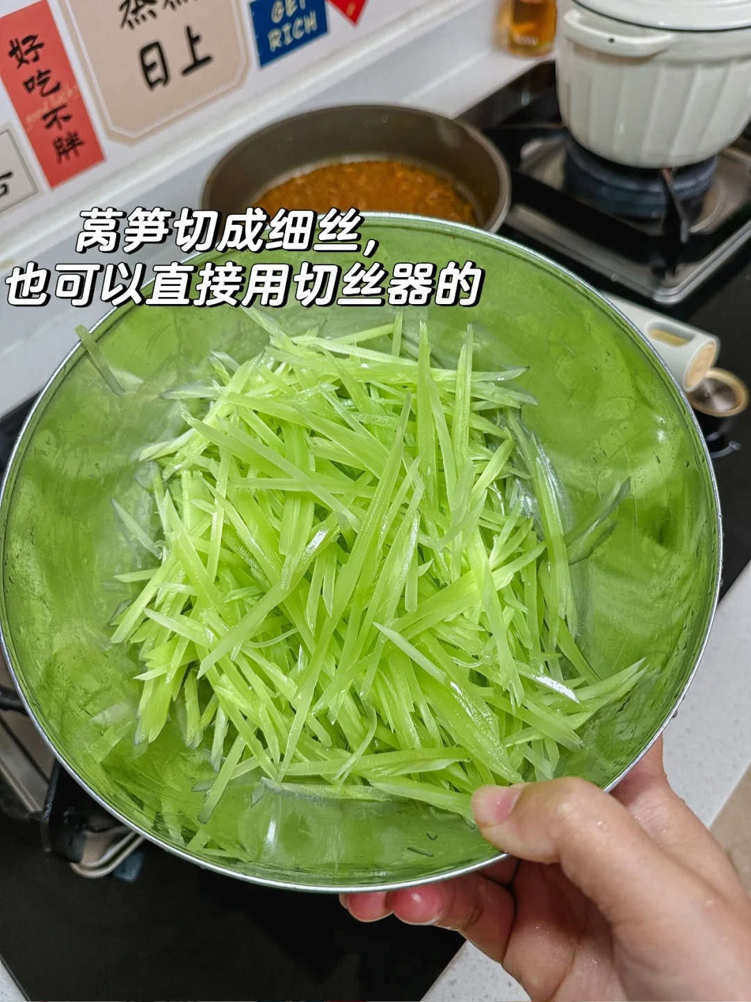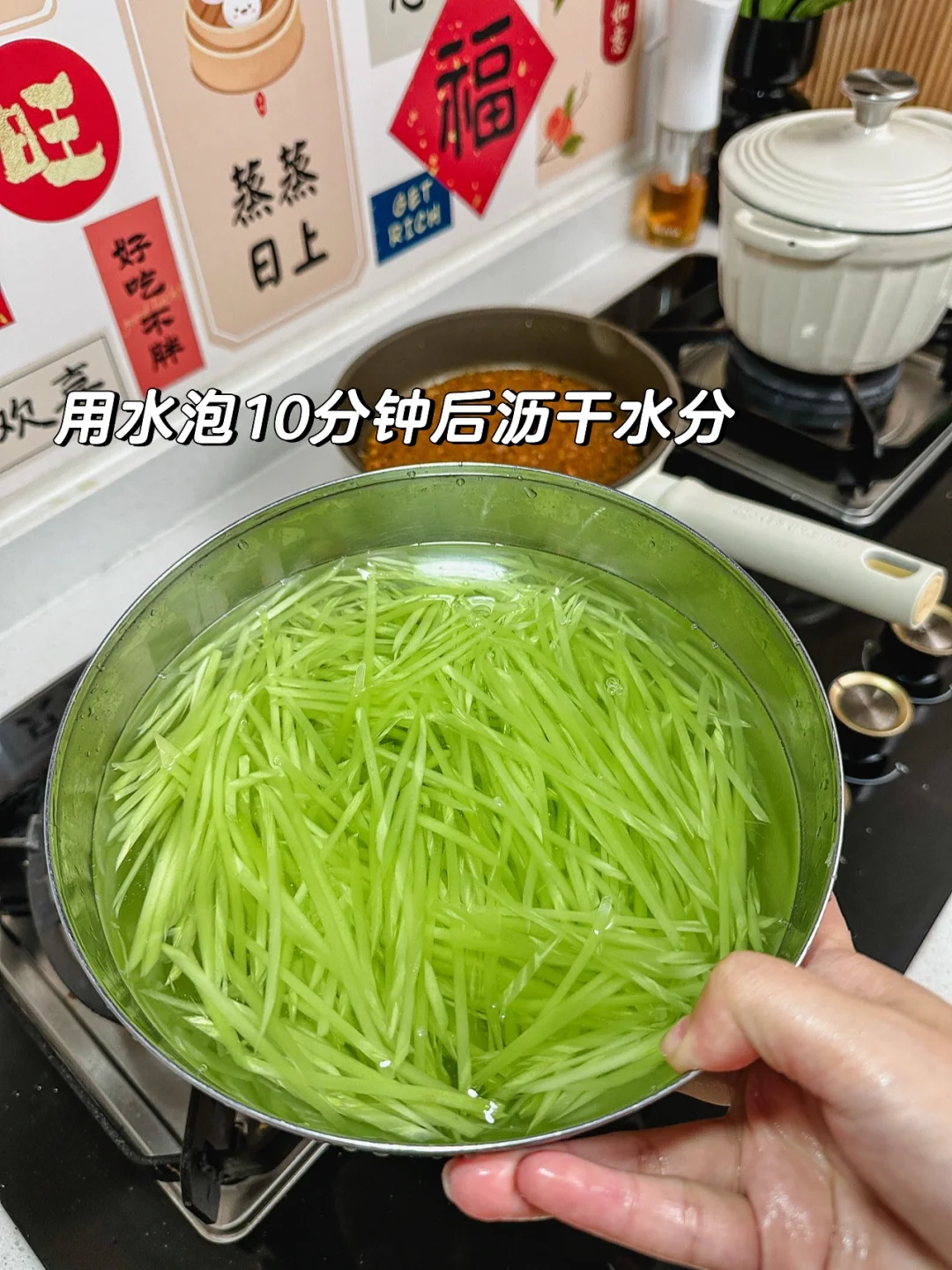 莴笋切丝后用水泡10分钟,这样做出来的口感翠爽鲜甜,饭店里都是这样子做的