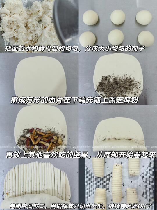 3、擀成方形的面片,在下端先铺上黑芝麻粉,在放上其它坚果,从底部开始卷起来,卷到中间用刮板或刀切点造型(嫌麻烦的也可以不切)继续卷起来就ok了!