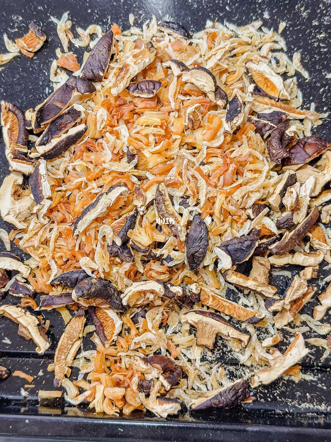 2.烤箱或空气炸锅140度烤40分钟左右,虾皮烤12分钟左右就可以先拿出来,期间多看两次香菇不要烤糊。