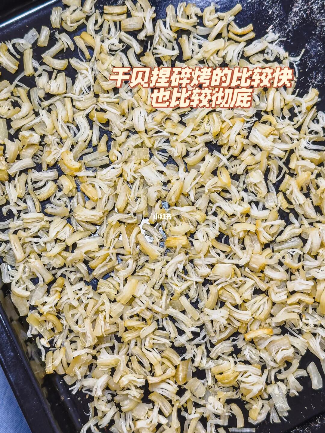 后和虾皮一起放烤盘中,干贝我我把它捏碎了些,烤的快些