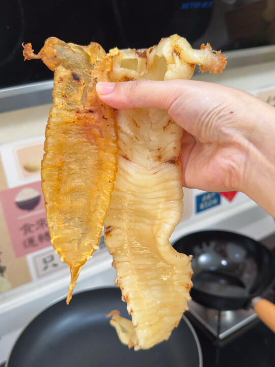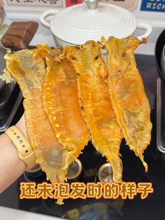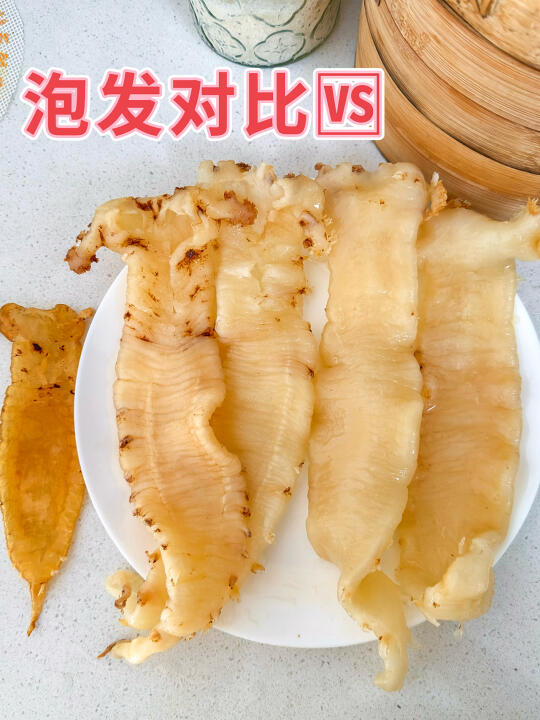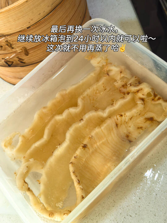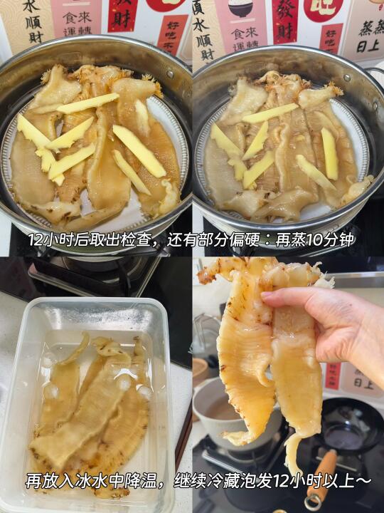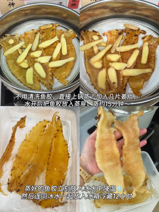 🔸详细步骤来了: 1⃣️ 不用清洗鱼胶,直接上锅蒸!加入几片姜片,水开后把鱼胶放入蒸屉,蒸约15分钟~👉(蒸完的鱼胶会明显缩水,也会变软) 2⃣️ 蒸好的鱼胶立刻放入冰水中降温❄️,然后连同冰水一起放入冰箱冷藏12小时🧊📌这一步是鱼胶膨胀吸水的关键! 3⃣️ 12小时后取出检查,如果还有部分偏硬:再蒸10分钟 ♨️再放入冰水中降温,继续冷藏泡发12小时以上~ 4⃣️最后再换一次冰水,继续放冰箱泡到24小时以内就可以啦~这次就不用再蒸了哈✌️ ✨泡出来的鱼胶又软又透,炖甜品或煲汤都超级赞!🥣🫶 顺便给大家推荐一些鱼胶菜单🧾 1⃣️【牛奶炖鱼胶】🥛✨ 2⃣️【椰汁桃胶炖鱼胶】🥥🍑 3⃣️【桂花红枣鱼胶羹】🌸🍵 4⃣️【花胶鸡汤】🐔🍲(超经典) 5⃣️【鲜虾鱼胶冬瓜汤】🦐🍈 6️⃣【鸡爪板栗鱼胶汤】🌰🐟 7️⃣ 【虫草花排骨炖鱼胶】🌸🍖