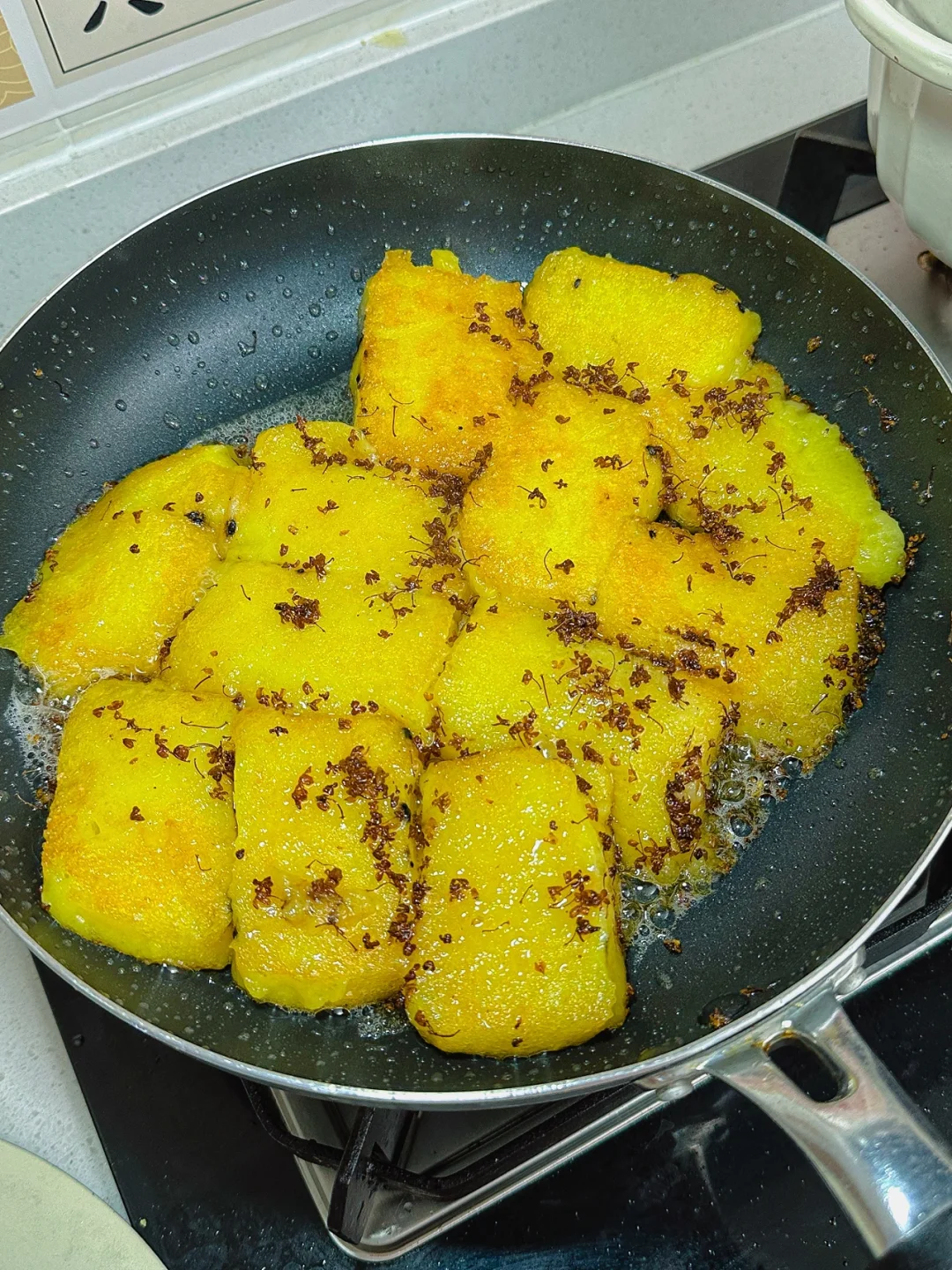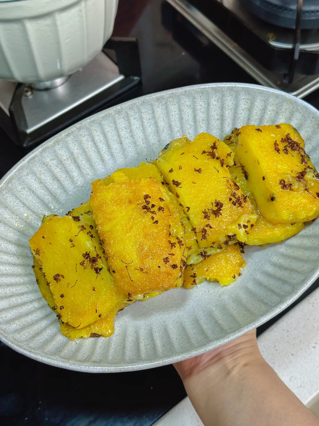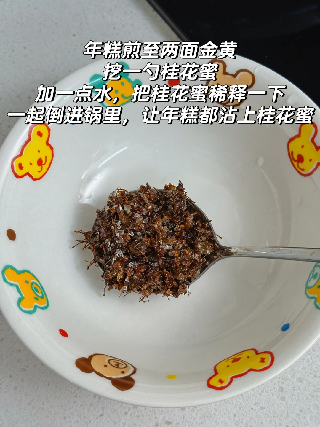 好不容易放假,没有出去人挤人,在家里追《余烬之上》 / 追剧总是少不了吃点宵夜的,拿出在急冻放了两个多月的年糕 / 年糕不用解冻,稍微缓一缓直接切片放锅里,放点水放点油直接盖盖煎,这样的保存方式和煎法,无论是在冰箱放了多久的年糕都不会开裂 / 两面都是焦脆的,里面又是糯糯的口感,配上一些桂花蜜,真的很有过年的感觉,就是那种很温暖的幸福感觉 / 有时候喜欢吃某样食物,并不只是喜欢食物的口感或是味道,而是他给我们带来的那种感觉和记忆。