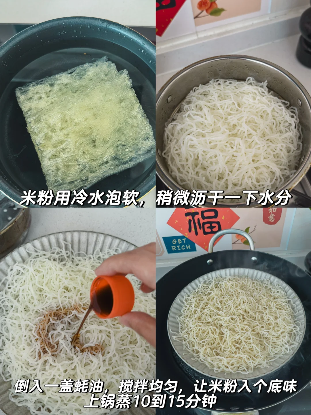 1.米粉用水泡软,稍微沥干一下水分,加入一瓶盖蚝油抓拌均匀,上锅蒸十来分钟
