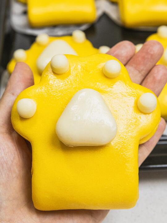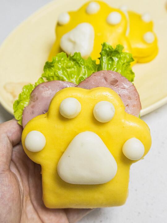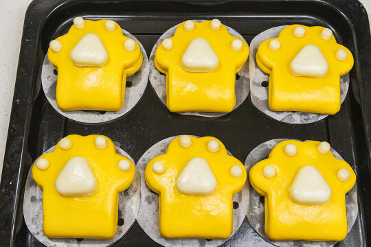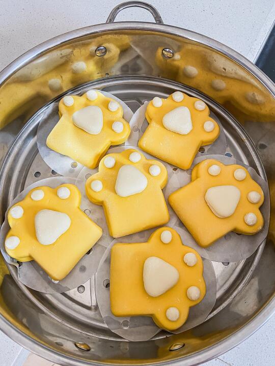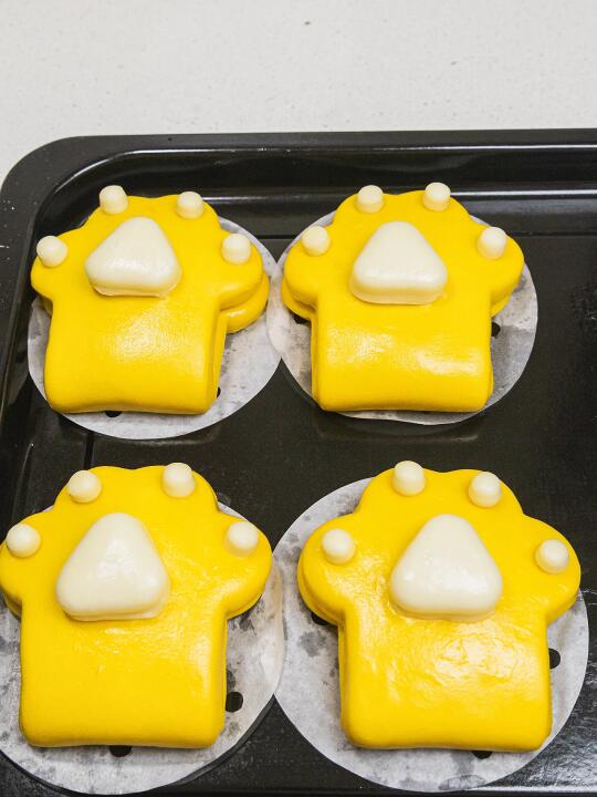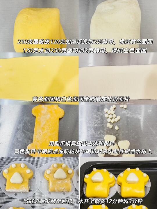 🌈🌈🌈食材: 黄面团:面粉250g,南瓜泥120g,酵母2g 白面团:面粉团250g,水120g,酵母2g 🥘🥘🥘做法: 1、蒸好的南瓜泥放凉,250g的面粉里放入120g的南瓜泥,加2g酵母揉成黄色面团 2、250g面粉加120g水和2g酵母揉成白色面团 3、把黄色面团和白色面团全部擀成长形面片(白色面团有多的可以留做老面) 4、用狗爪模具按压出主体和配件 5、黄色配件中间刷点油防沾,从中间对折起来,小配件刷点水沾上 6、发酵至两倍大,水开上锅蒸十二分钟,闷三分钟即可
