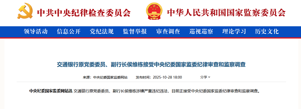 上证报中国证券网讯据中央纪委国家监委网站10月28日消息,交通银行原党委委员、副行长侯维栋涉嫌严重违纪违法,目前正接受中央纪委国家监委纪律审查和监察调查。