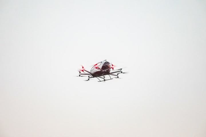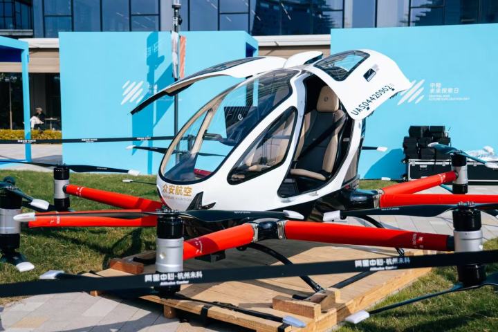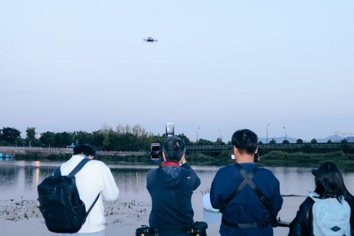 电动垂直起降飞行器(eVTOL)完成余杭首飞——EH216-S型“空中出租车”从阿里公园腾空而起,沿着中轴线低空掠过。机身银白闪亮,螺旋桨轻盈转动,划出一道流畅的弧线。