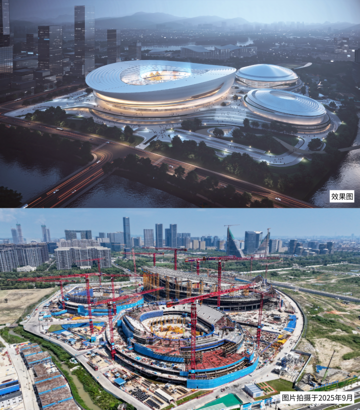 截至2025年9月,项目已完成总工程量的35%。体育馆及游泳跳水馆工程主体结构全面封顶,足球场主体结构已完成90%,轮廓日渐清晰,如一枚正在成型的“良渚玉璧”。