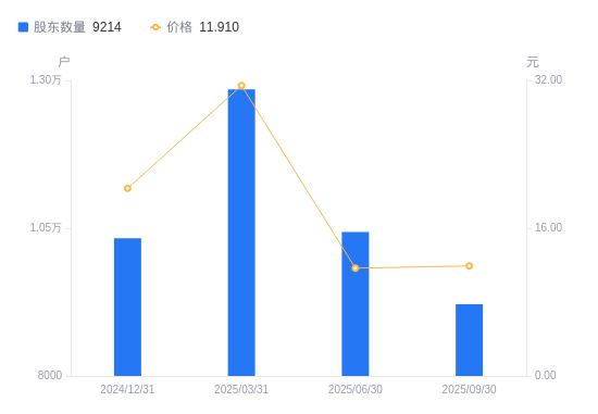 日期A股户数(户)流通A股户均持股数(股)户均持股市值(万元)2025-09-3092148801.9210.482025-06-30104377770.529.072025-03-31128506311.3519.842024-12-31103317850.2415.942024-09-3095778468.3011.682024-06-3094928544.139.312024-03-3198578227.7411.182023-12-31103867808.6714.562023-09-3089199093.0512.422023-06-30120436734.2812.30