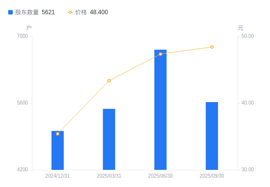 日期A股户数(户)流通A股户均持股数(股)户均持股市值(万元)2025-09-3056216513.0831.522025-06-3067205447.9225.792025-03-3154806680.6628.962024-12-3150157300.1025.842024-09-3042285274.3616.292024-06-3037585934.0113.892024-03-3135825667.2316.242023-12-3145614450.7818.44