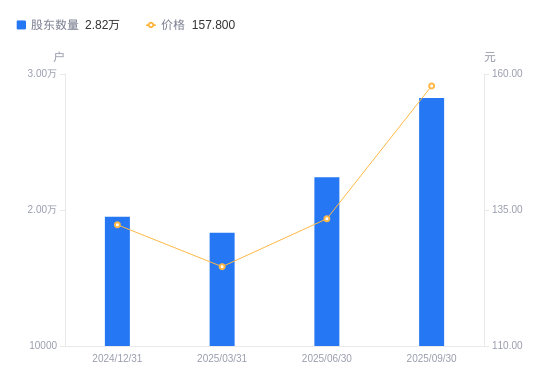 日期A股户数(户)流通A股户均持股数(股)户均持股市值(万元)2025-09-302823214203.74224.142025-06-302241117893.00238.672025-03-311832215262.78190.142024-12-311951014333.40189.602024-09-301520218395.26220.042024-06-301563017891.54157.322024-03-311616717221.17150.272023-12-311708816293.00180.222023-09-301502318532.57161.012023-06-301035226894.78308.73