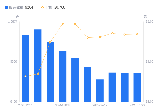 日期A股户数(户)流通A股户均持股数(股)户均持股市值(万元)2025-09-3092755380.5911.212025-09-1990695502.8111.282025-08-2994455283.7510.792025-08-2097015144.3111.212025-08-0899163594.347.842025-06-30102013493.926.982025-03-31105693417.925.742024-12-31103983474.135.752024-09-3099543700.675.792024-06-3099573699.565.10