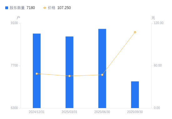 日期A股户数(户)流通A股户均持股数(股)户均持股市值(万元)2025-09-3071807499.0180.432025-06-3089096043.6528.422025-03-3186604423.1120.052024-12-3187554375.1121.272024-09-3089474281.2216.622024-06-3099833836.9311.592024-03-3193374016.7212.942023-12-3195843913.2014.882023-09-3091324106.8915.182023-06-3088913462.0313.11
