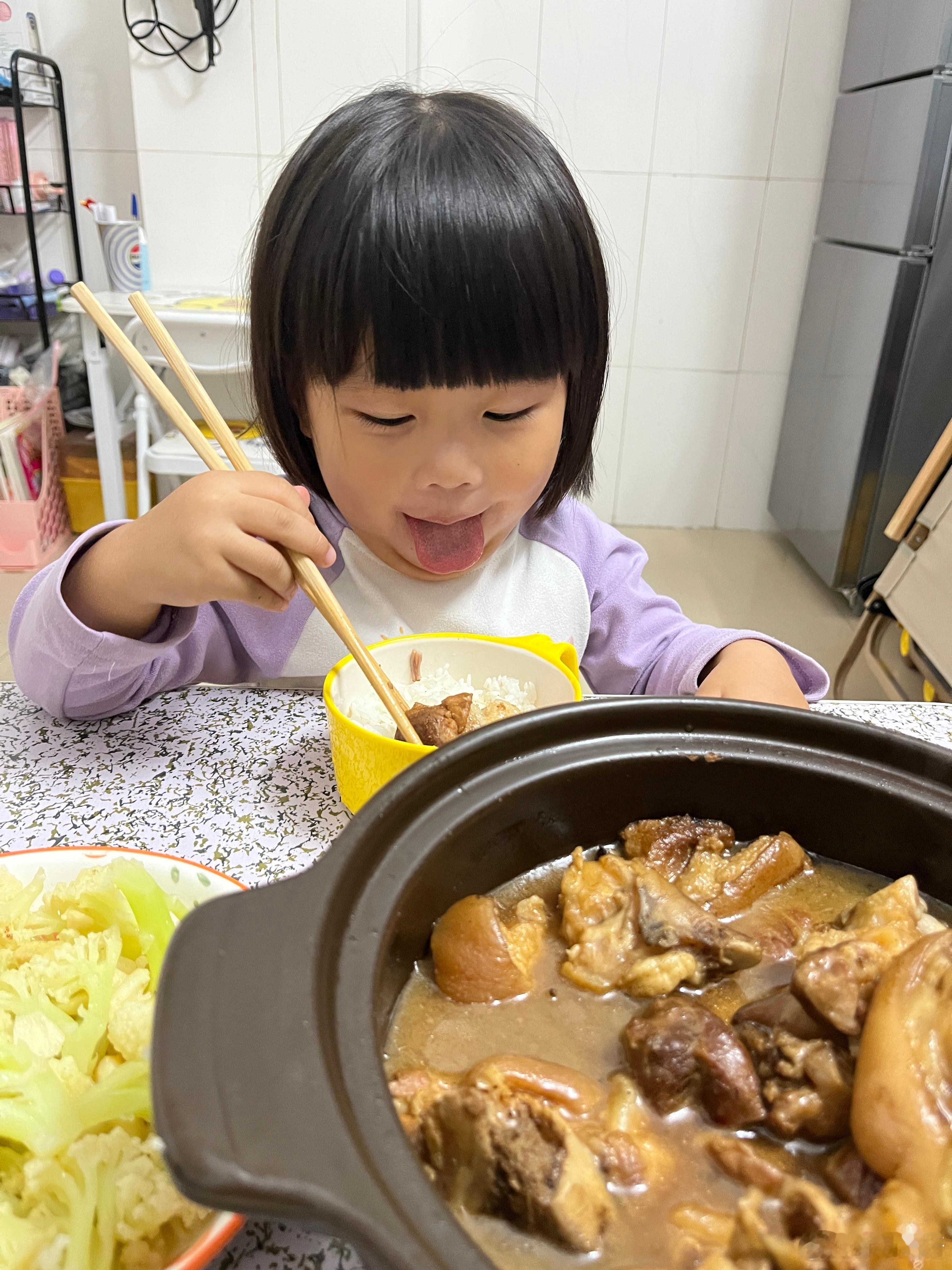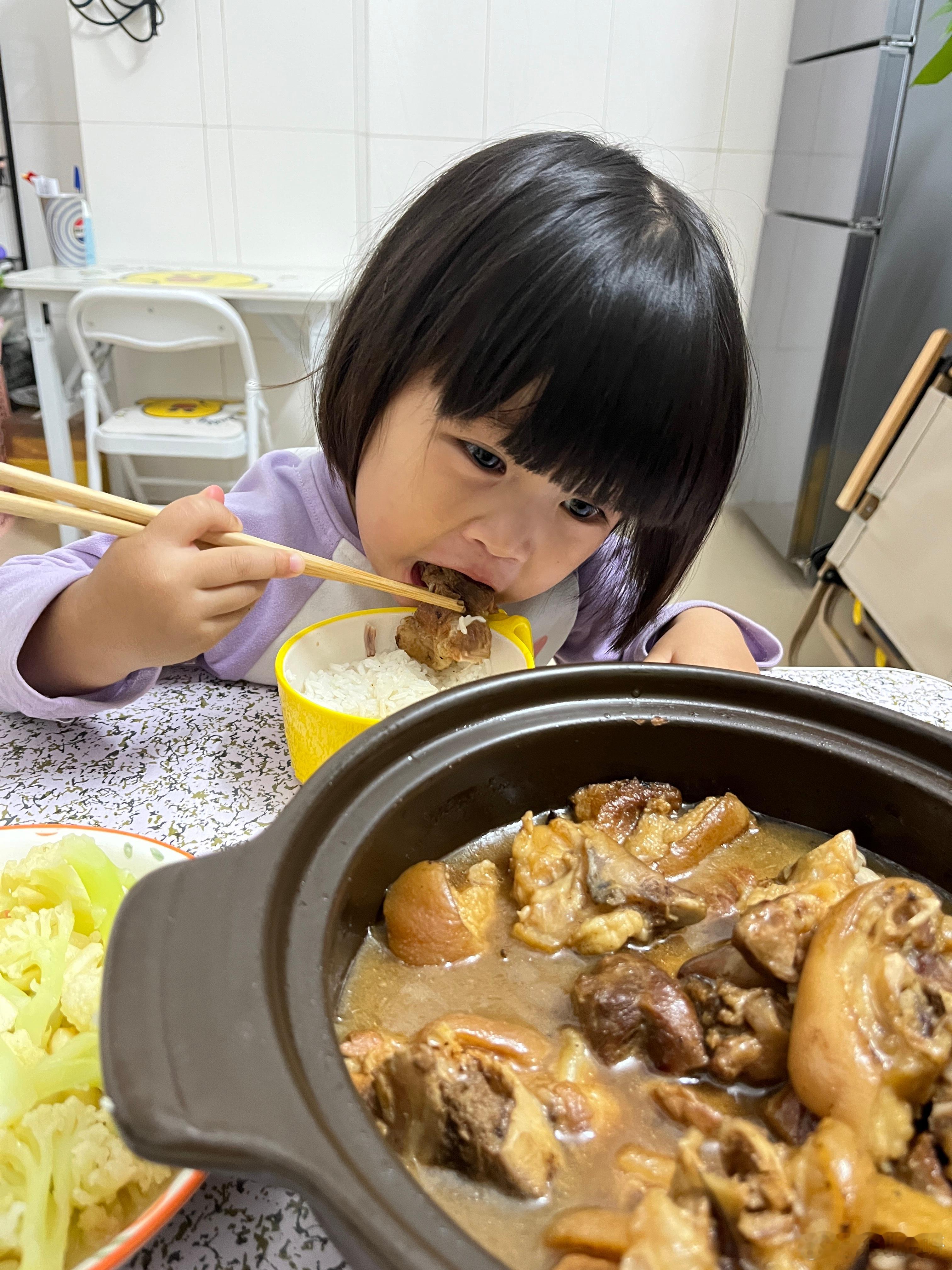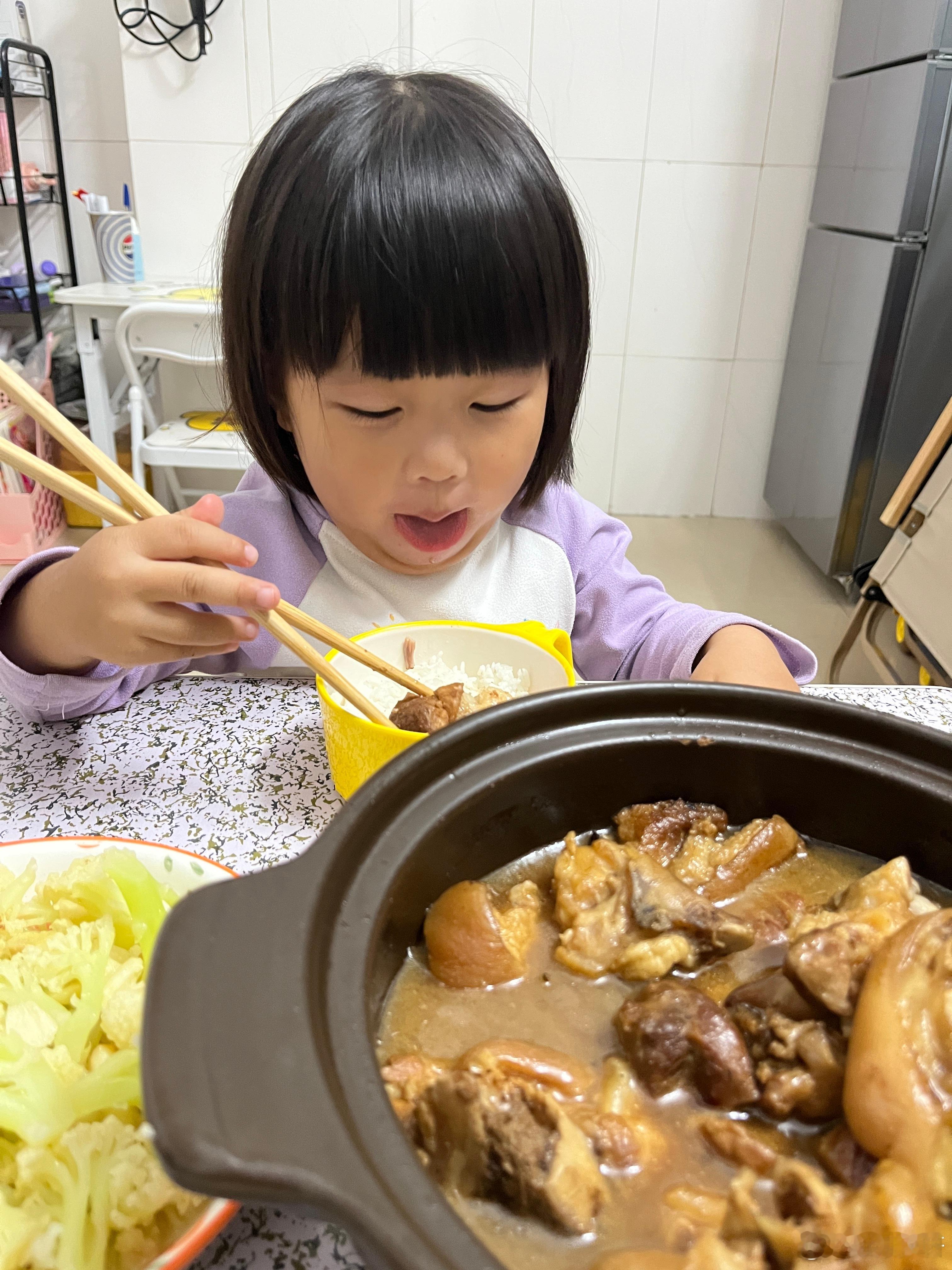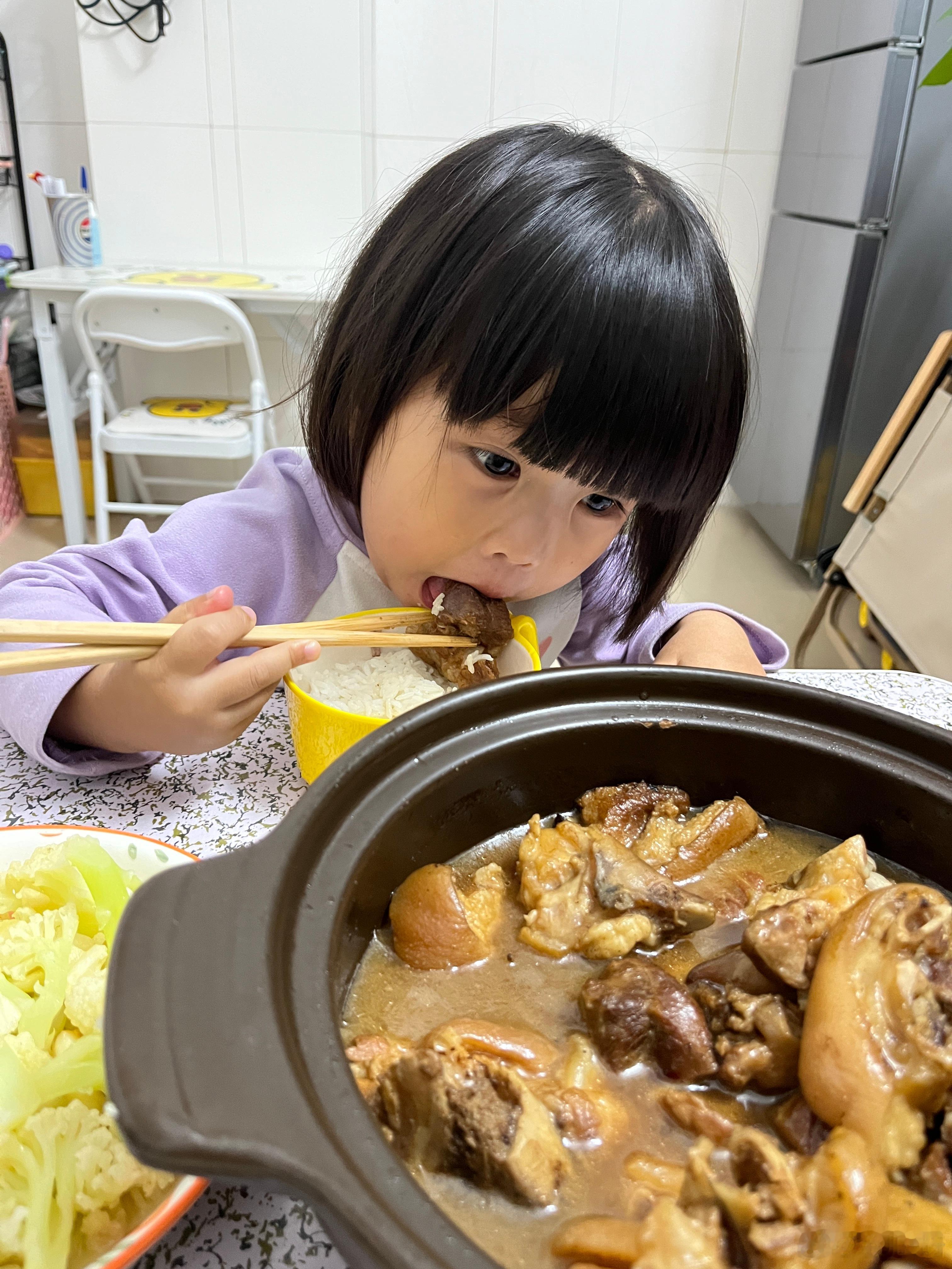 吃饭了,今晚吃猪蹄、西兰花,女儿说好香,在公园的时候就说饿了,回家要吃2碗饭,把