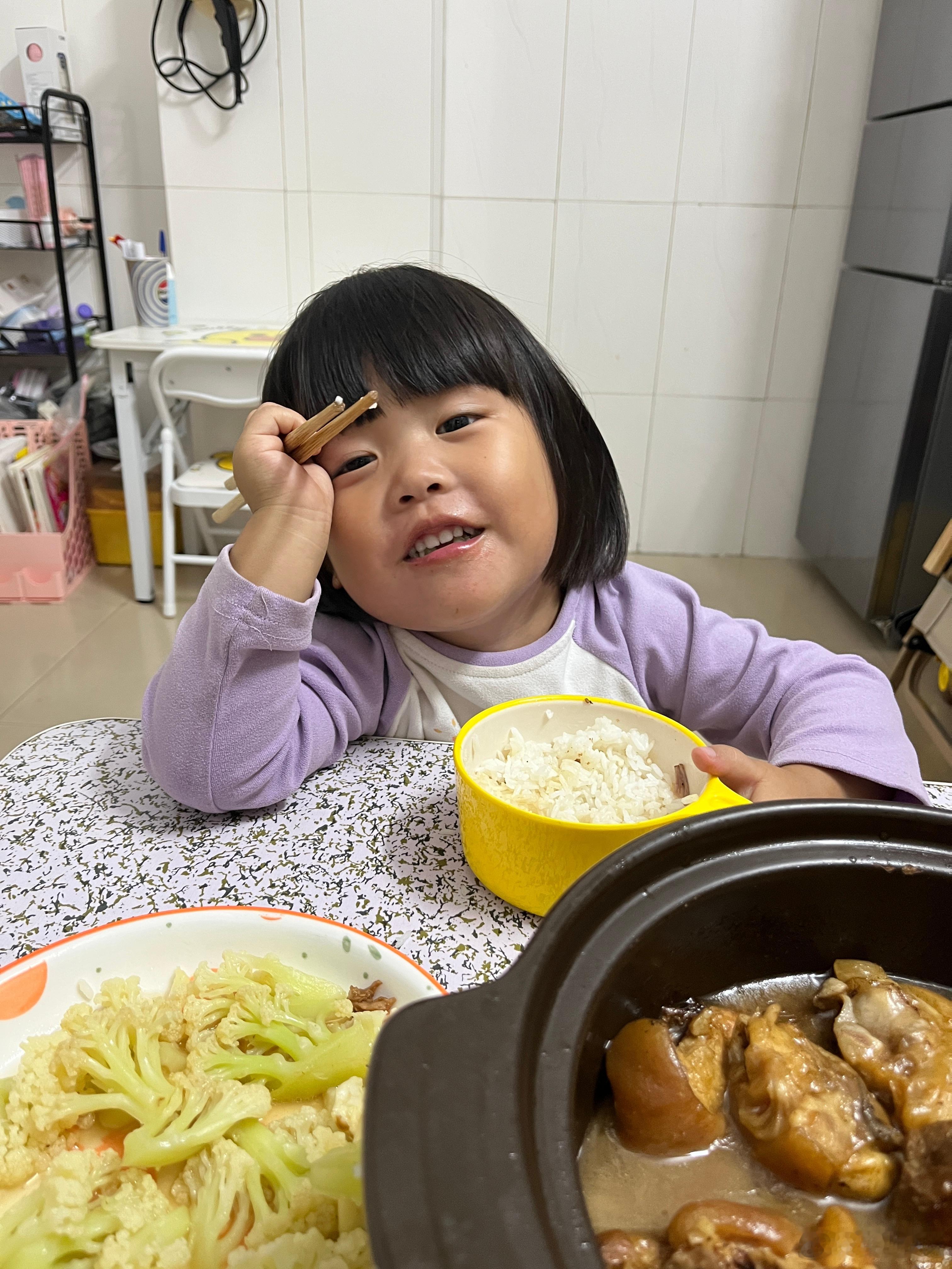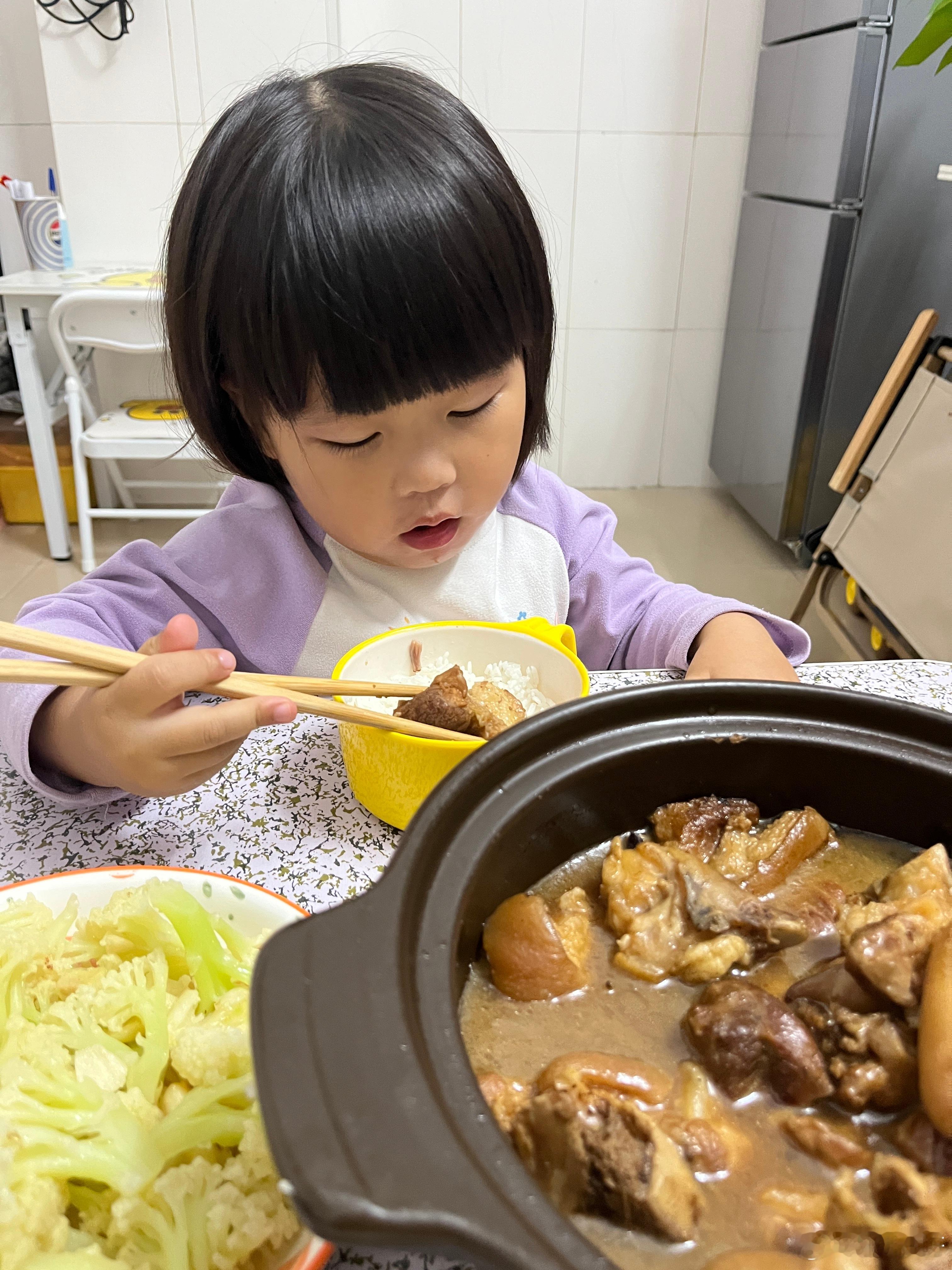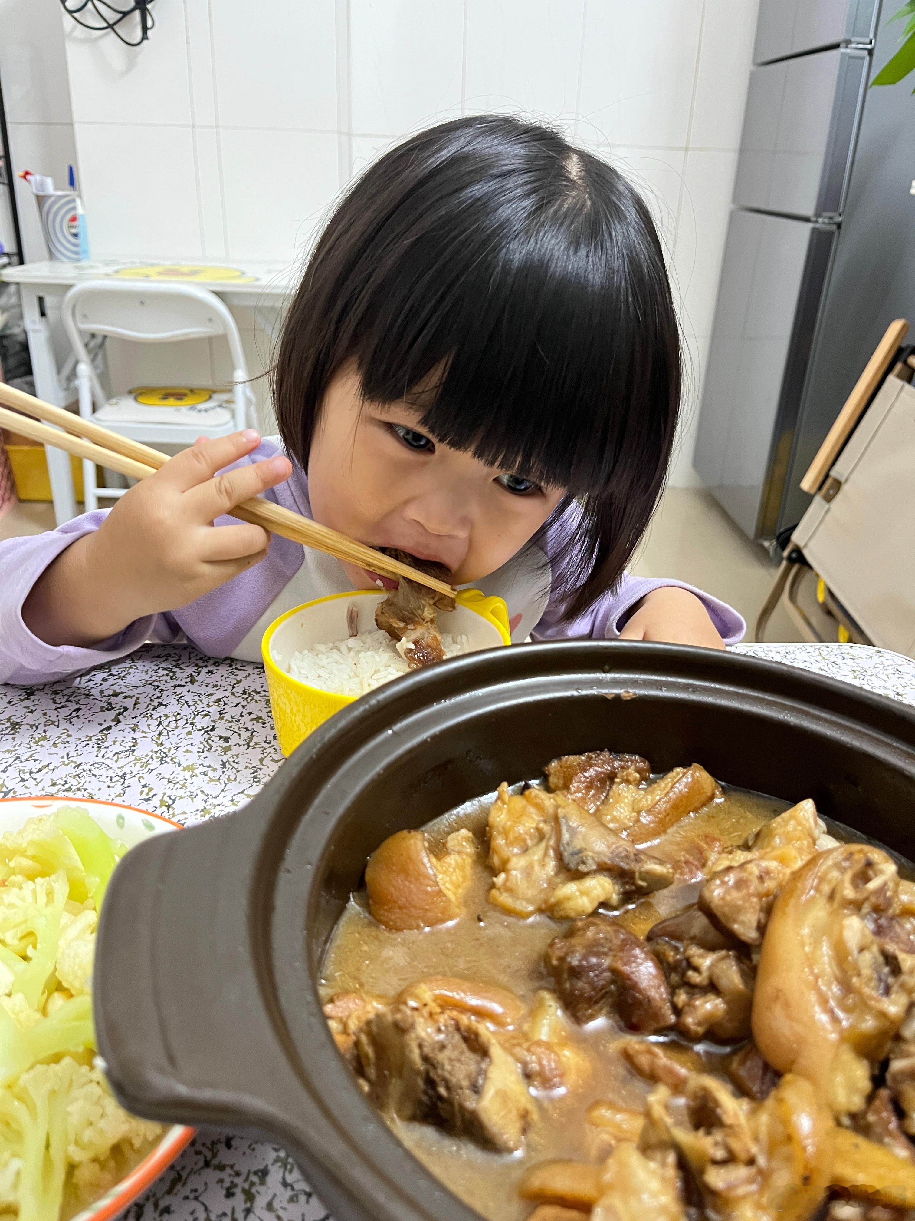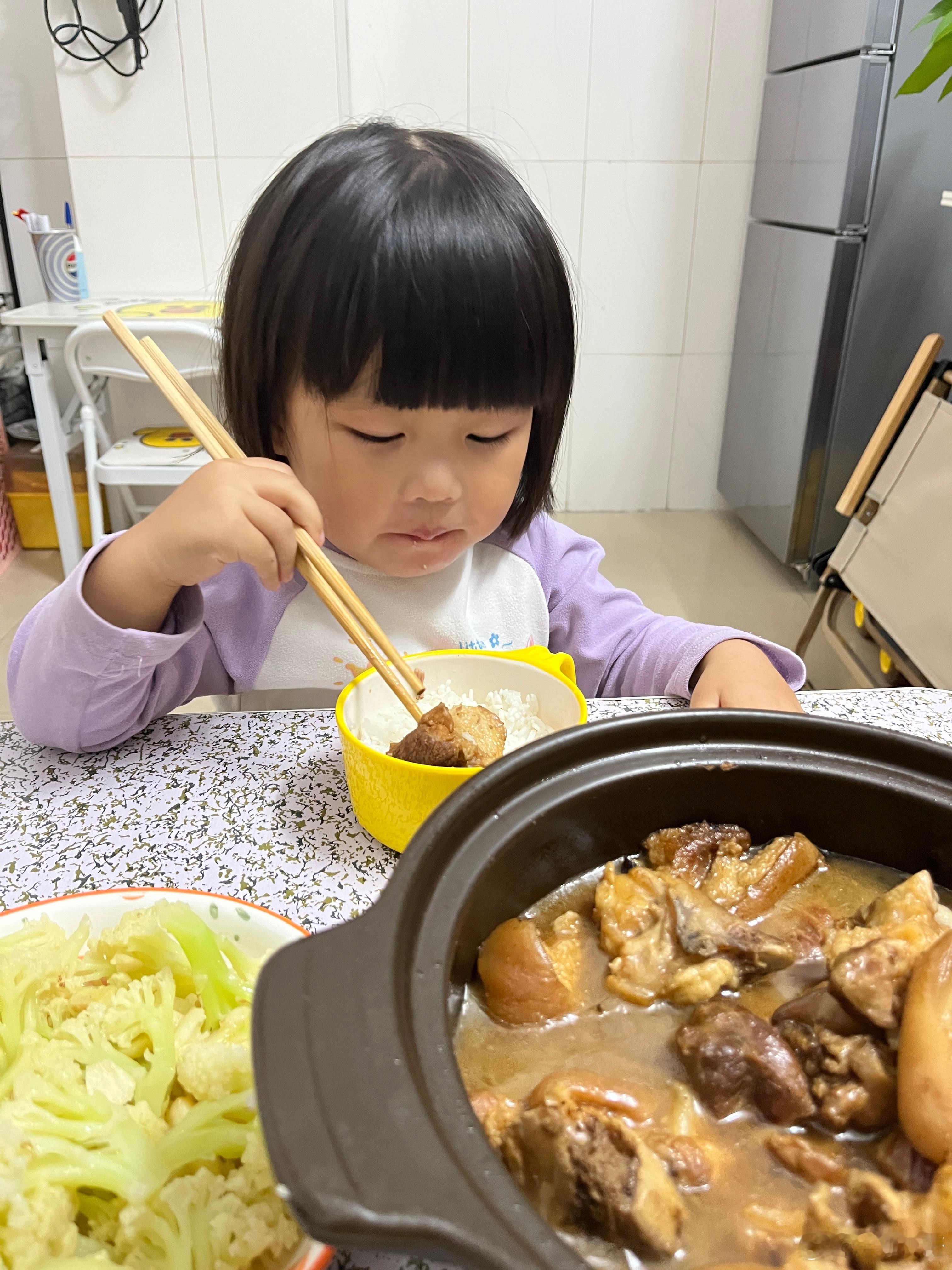 吃饭了,今晚吃猪蹄、西兰花,女儿说好香,在公园的时候就说饿了,回家要吃2碗饭,把