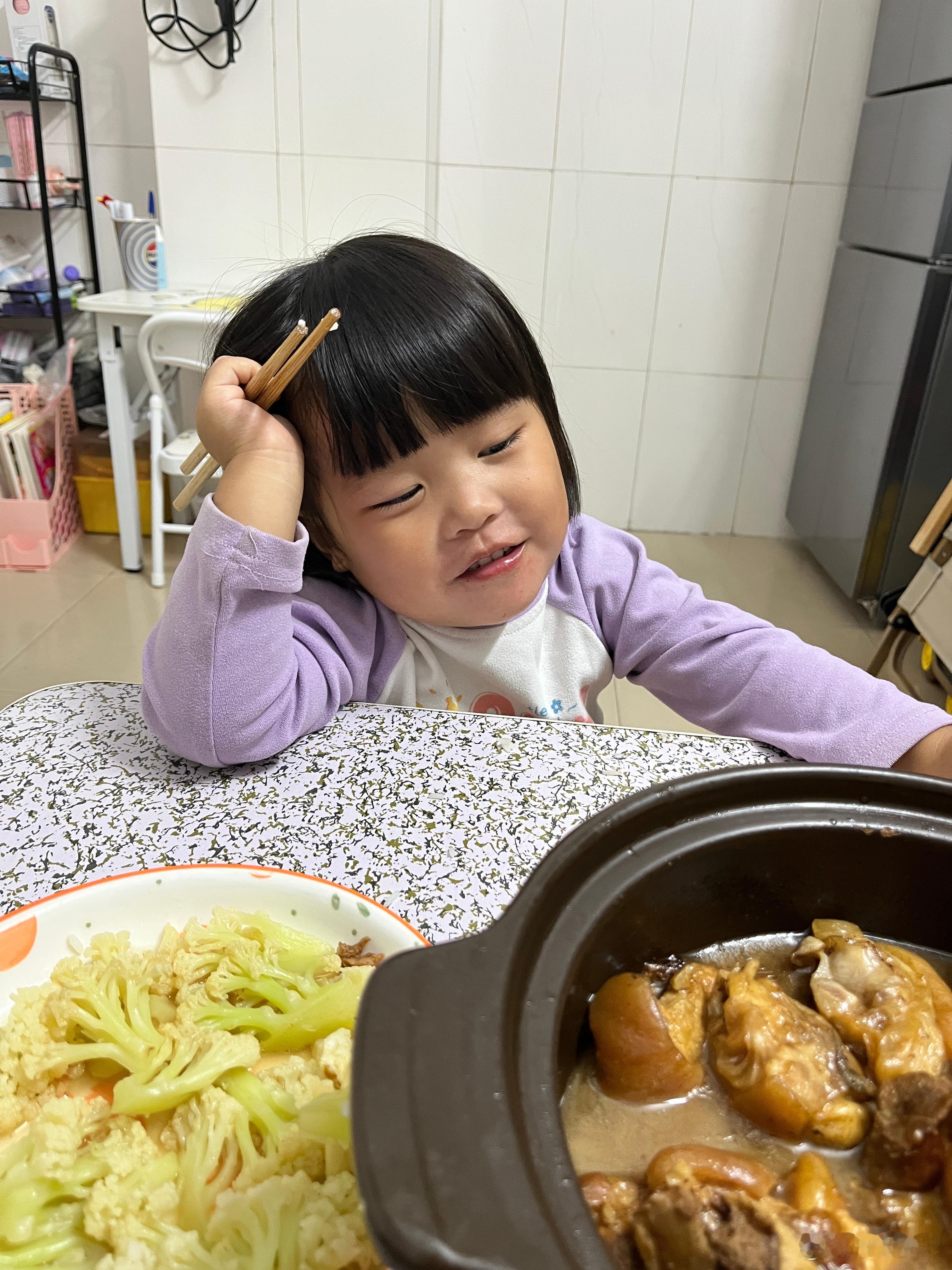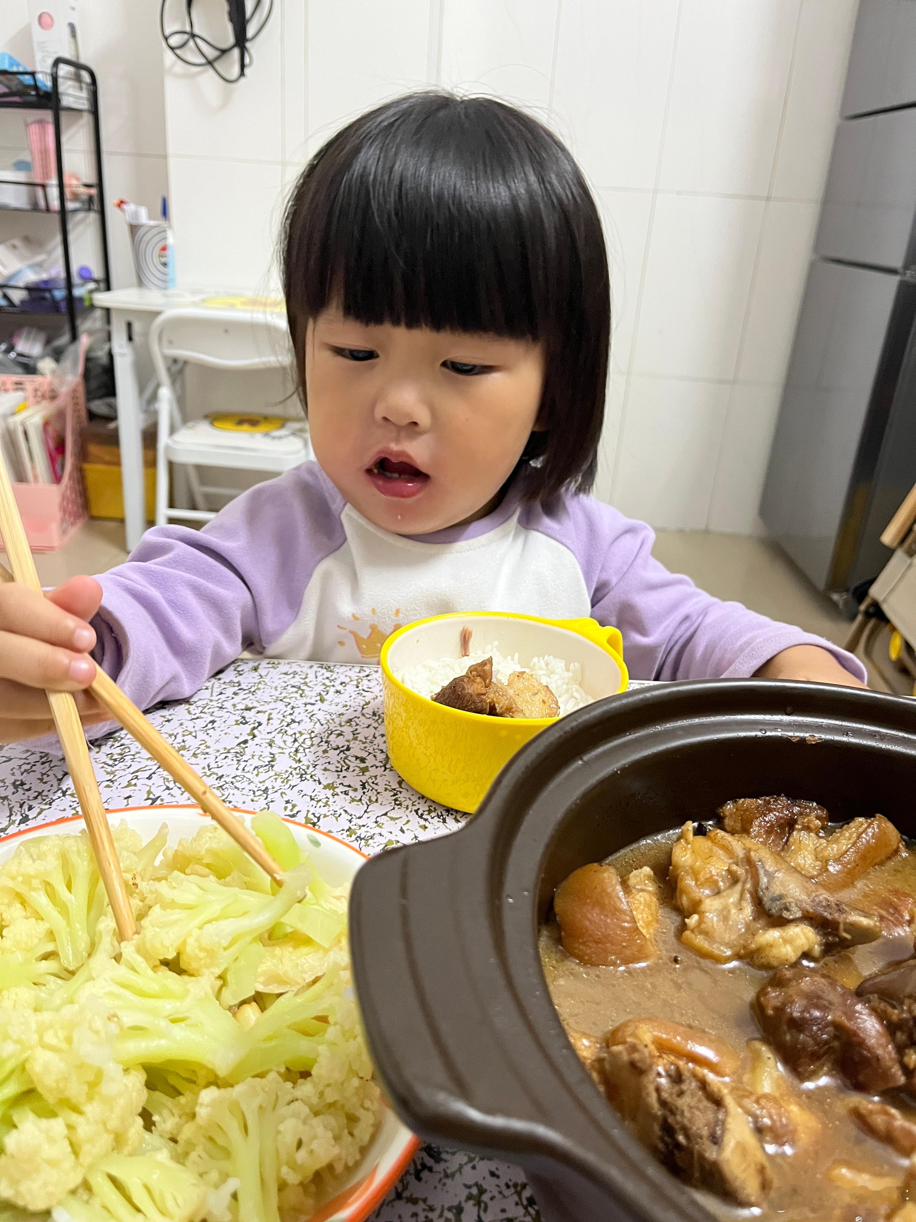你家小孩是不是不爱吃青菜,大人先吃,还要吃出很美味的感觉,边吃边说真美味,吃了会长高,她就会吃了,我家每次都是用这招[允悲][允悲]我家的日常宝贝成长守护计划晚饭