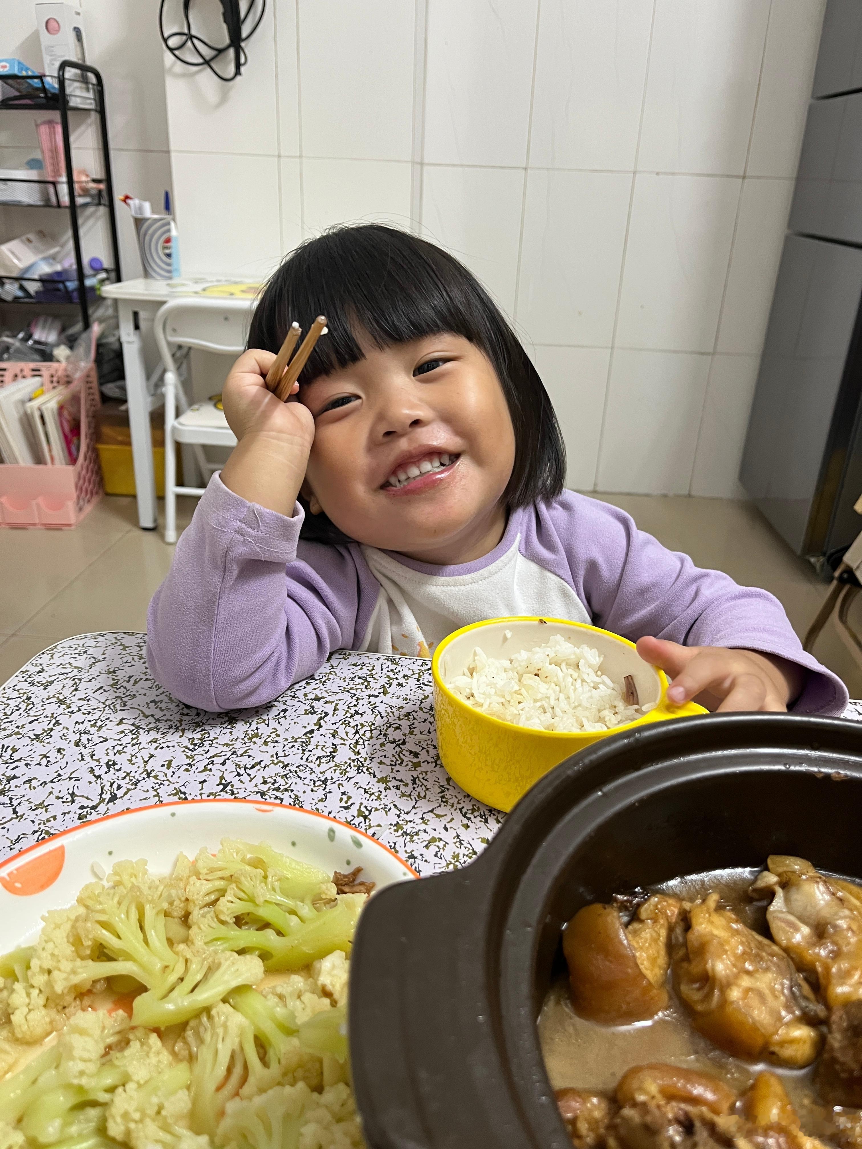 吃饭了,今晚吃猪蹄、西兰花,女儿说好香,在公园的时候就说饿了,回家要吃2碗饭,把碗里的饭吃完都不错,她不知道两碗是多少。