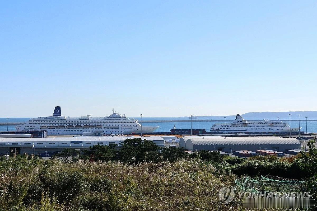 图一:10月28日,“鼓浪屿”号邮轮停靠在位于韩国庆尚北道浦项市迎日湾港。 韩联社