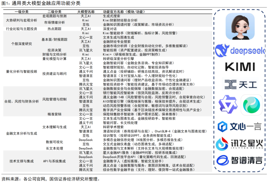 通用类大模型在金融领域的应用体现了其核心能力的灵活扩展与场景化深度适配。凭借强大的自然语言处理与多模态能力,通过行业数据微调、插件化工具及提示词工程,这些模型将通用功能高效转化为金融专业服务。其共性在于提供文本生成、数据分析、知识问答与代码辅助等标准化支持,覆盖投研、风控、营销及客服等主流场景;特性上则呈现差异化定位:DeepSeek聚焦量化策略与代码生成,讯飞星火强化API集成与系统适配,豆包侧重交互式数据可视化,而腾讯元宝深耕数字资产管理与生态服务,共同形成互补格局。
