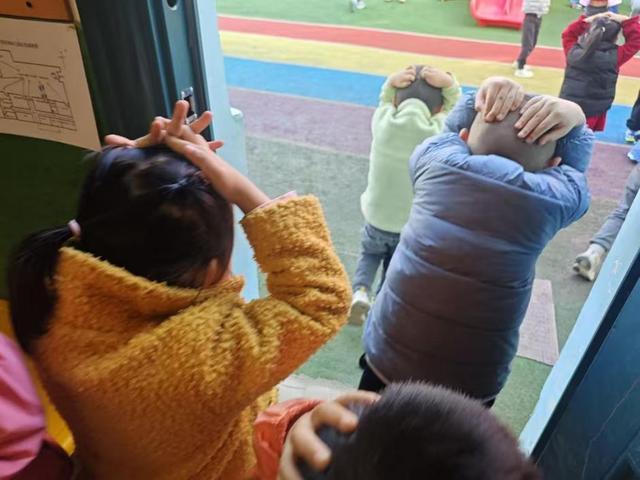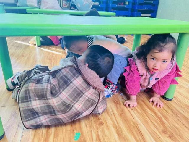 上午10时,随着第一声防震警报信号响起,演练正式启动。各班教师迅速引导幼儿双手抱头、弯腰低姿,快速躲到课桌、墙角等安全区域,用书包或双手护住头部,避免头部受伤。约1分钟后,第二声疏散警报响起,教师立即组织幼儿按照预定路线,保持安全间距,弯腰快速、有序地向操场空旷区域疏散。过程中,教师全程陪护在幼儿身旁,提醒孩子们不推挤、不慌张,确保每一名幼儿安全撤离。