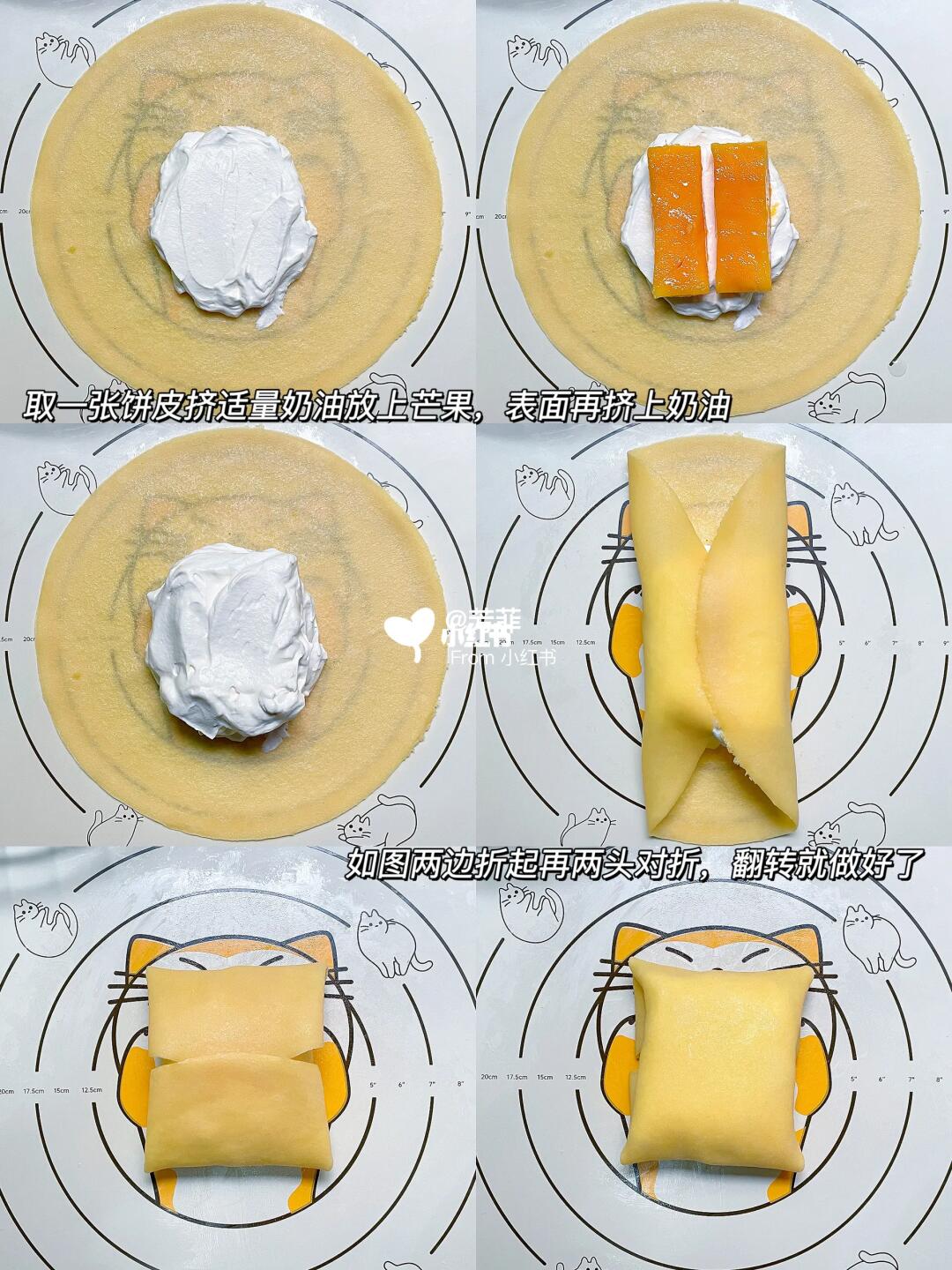🌿将芒果去皮切大块,淡奶油加砂糖打发至有纹路硬性.取一张班戟皮挤上淡奶油放上芒果,再抹上淡奶油.接着将饼皮如图两边对折,再两头对折翻转就做好啦⚠️做好放冰箱冷藏半小时再吃,口感更好哦