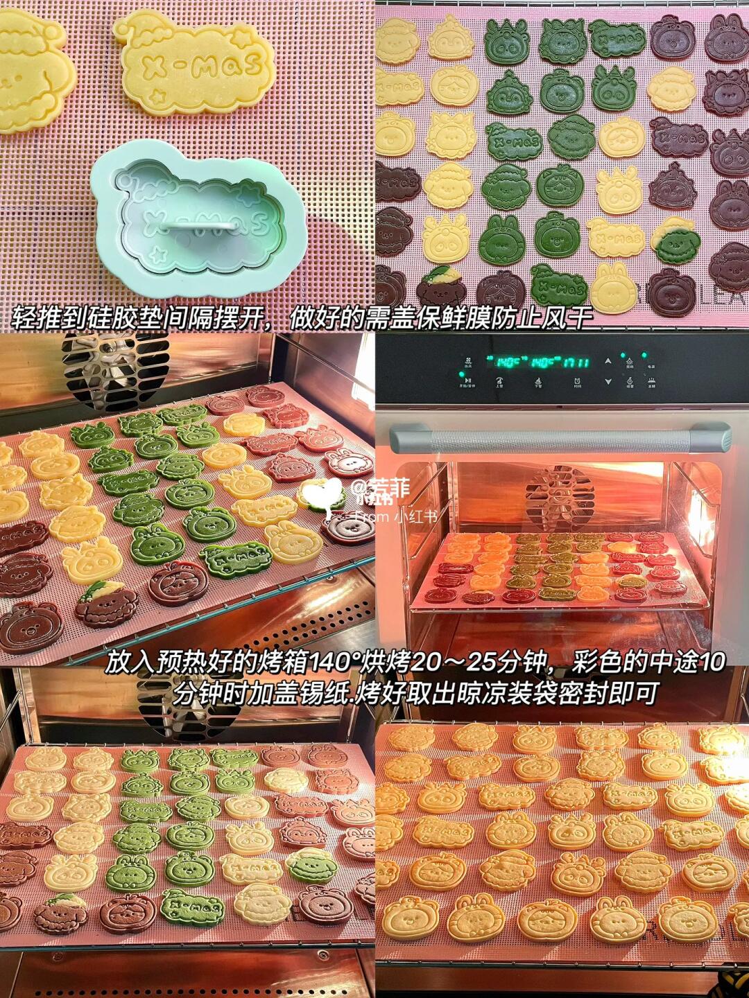 4️⃣间隔摆入烤盘,放入提前预热好的烤箱中层.上下火140°烘烤20~25分钟.⚠️加了色粉想颜色好看可以在烘烤十分钟时加盖锡纸,能保留原色.烘烤温度和时间需按自家烤箱温差灵活调节
