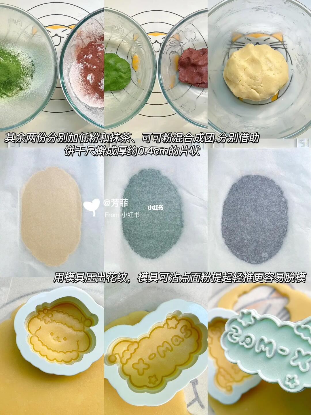 3️⃣三个面团借助饼干尺,上下垫油纸擀开厚约0.4㎝左右的片状.可冷藏20分钟左右再压模,也可直接操作.用饼干模具压出纹路,力道均匀纹路要清晰.✔️边角料抓捏成团擀开再压模,重复用完就好