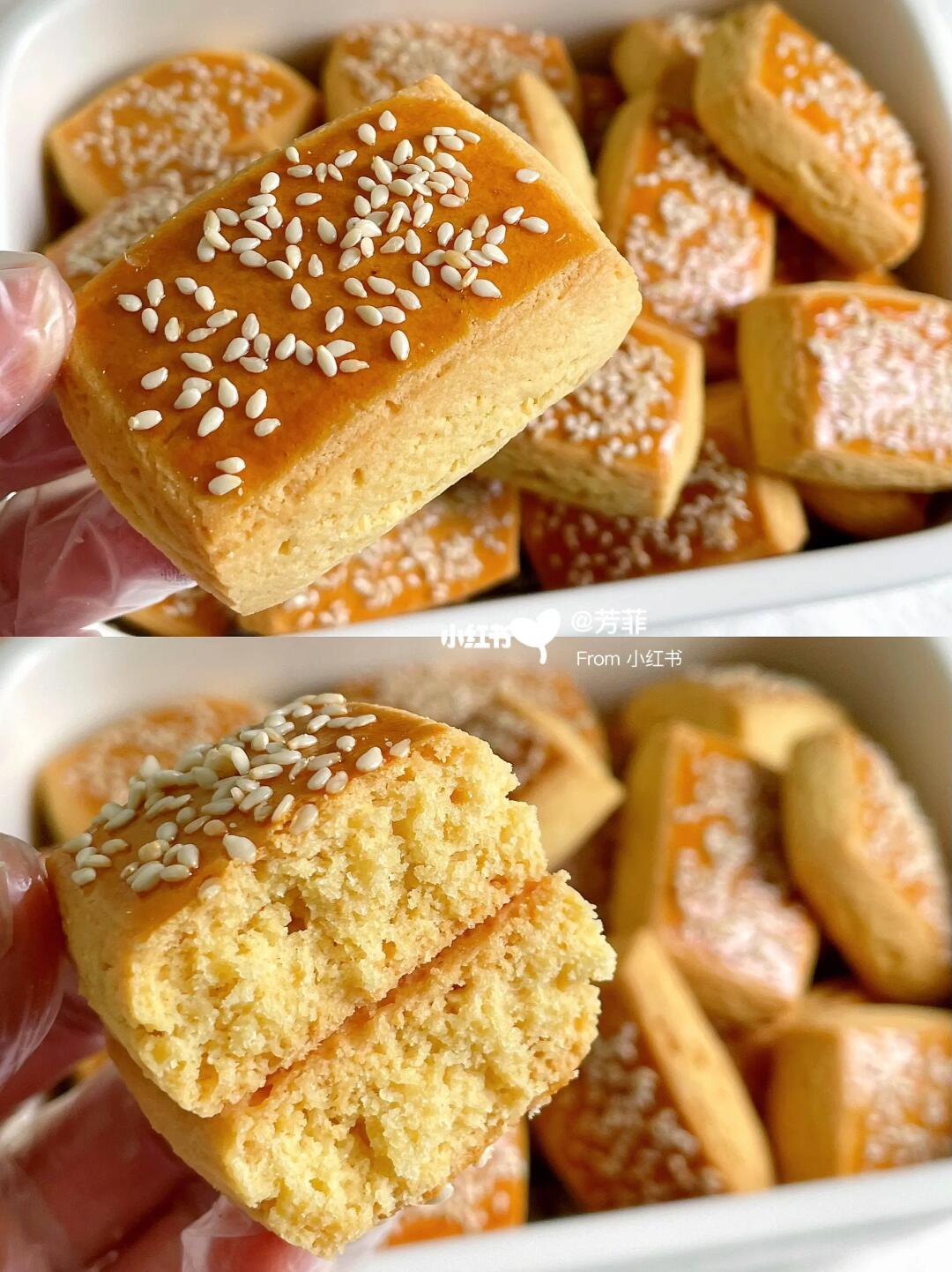 2️⃣擀成厚约1㎝的长方形,均匀切块.摆入烤盘刷蛋黄液撒芝麻,放入预热好的烤箱.上下火170°烘烤20分钟左右,上色金黄出炉