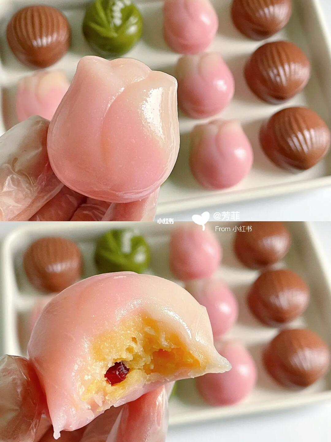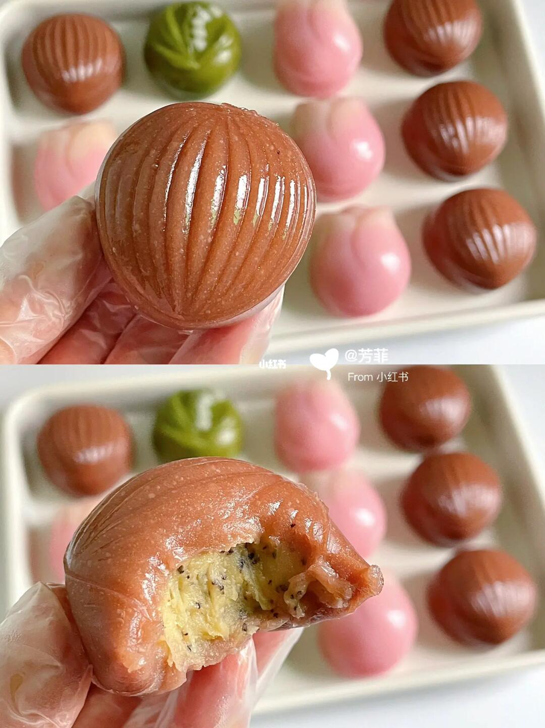 5️⃣三个颜色的团子均分成25克一个,馅料均分成25克一个.青团皮包金沙咸蛋黄奶黄馅,棕色包伯爵红茶奶黄馅、粉色包椰蓉蔓越莓奶黄馅.分别包圆
