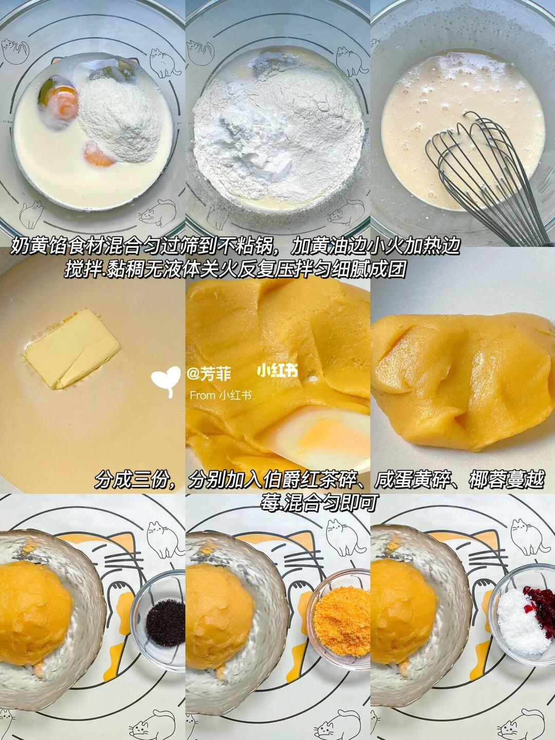 1️⃣奶黄馅食材除开黄油其余混合匀,过筛到不粘锅加黄油,小火边加热边搅拌.没液体变黏稠后关火,利用余温反复压拌翻炒到不粘锅底状态.晾凉分成三份,一份加咸蛋黄碎,一份加伯爵红茶碎,一份加椰蓉蔓越莓碎,分别混合匀备用