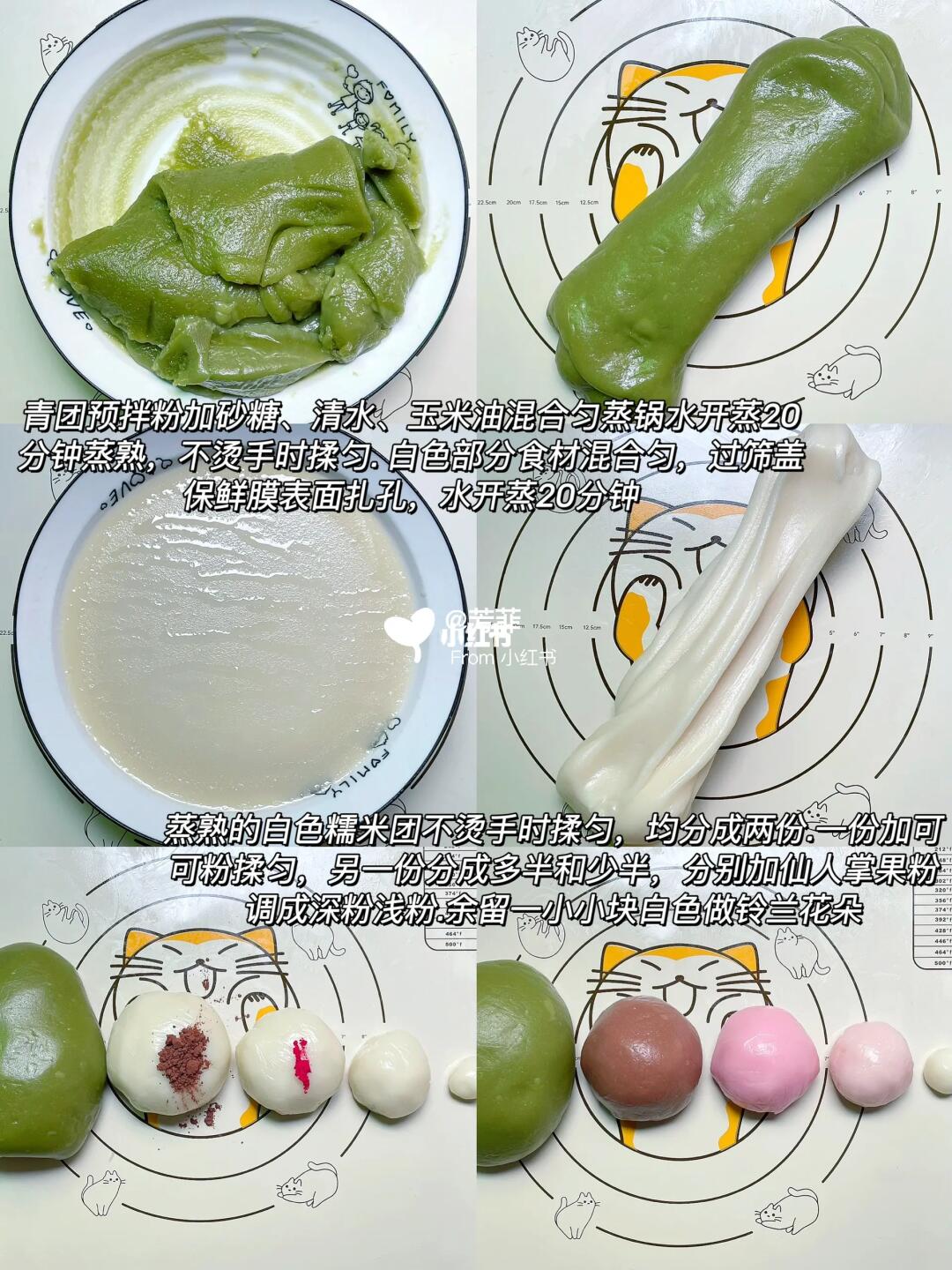 🌱白色团:糯米粉40克 粘米粉30克 澄粉30克 砂糖40克 纯牛奶170克 玉米油20克 可可粉/仙人掌果粉/适量