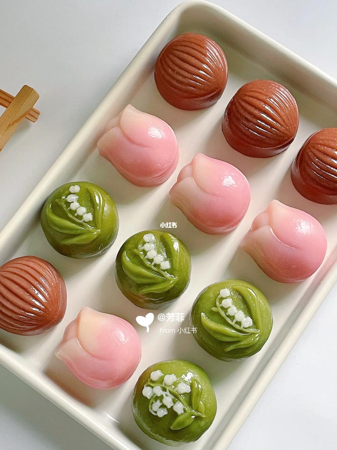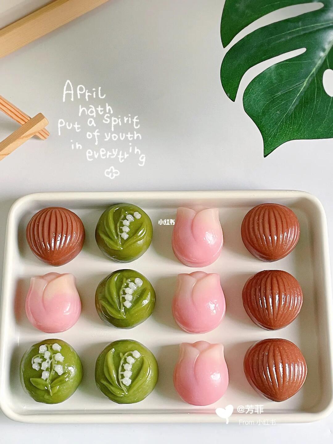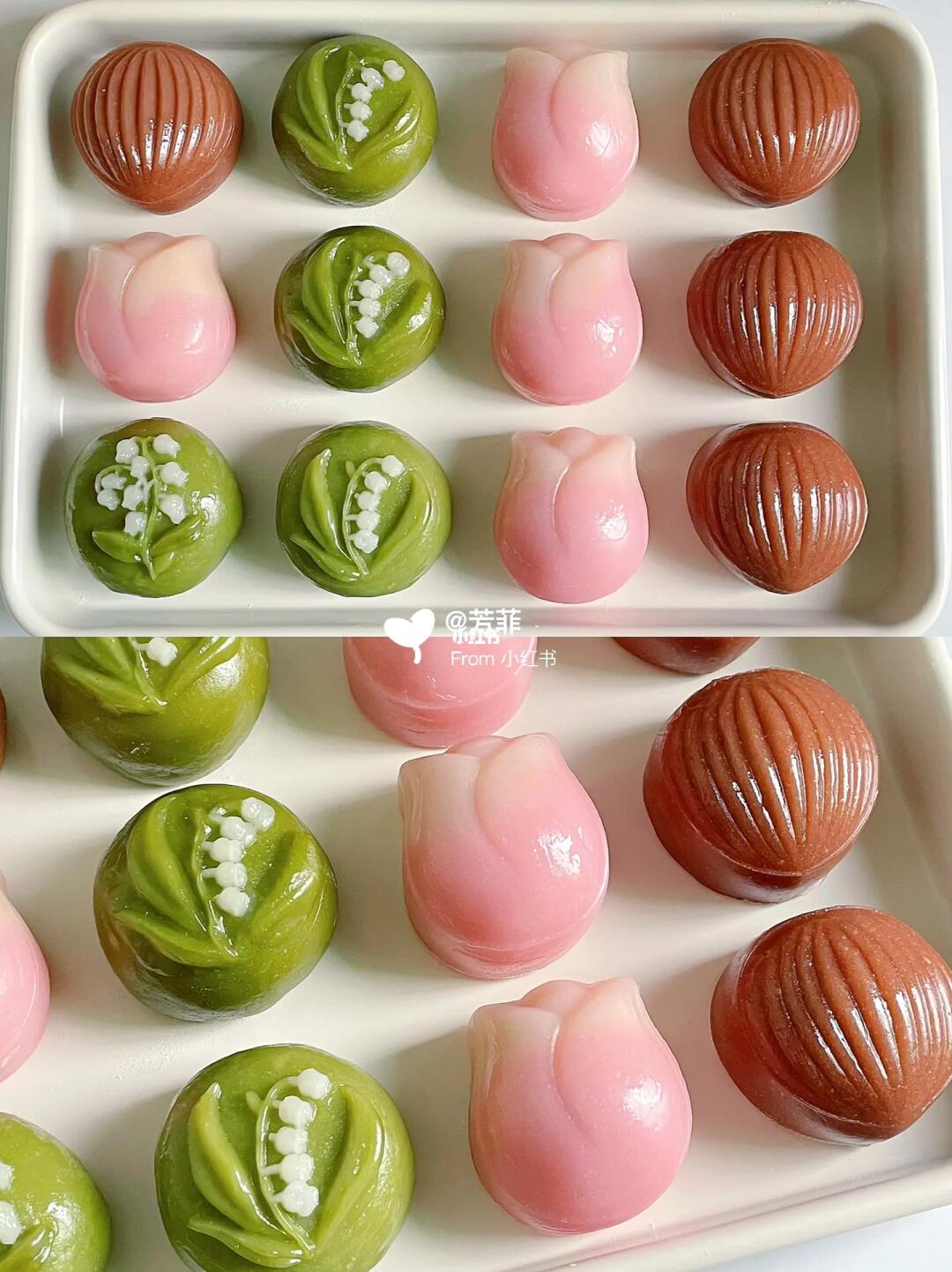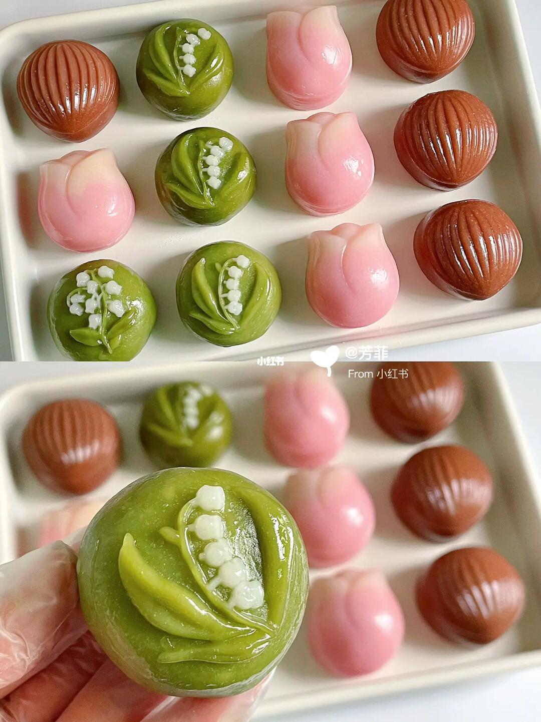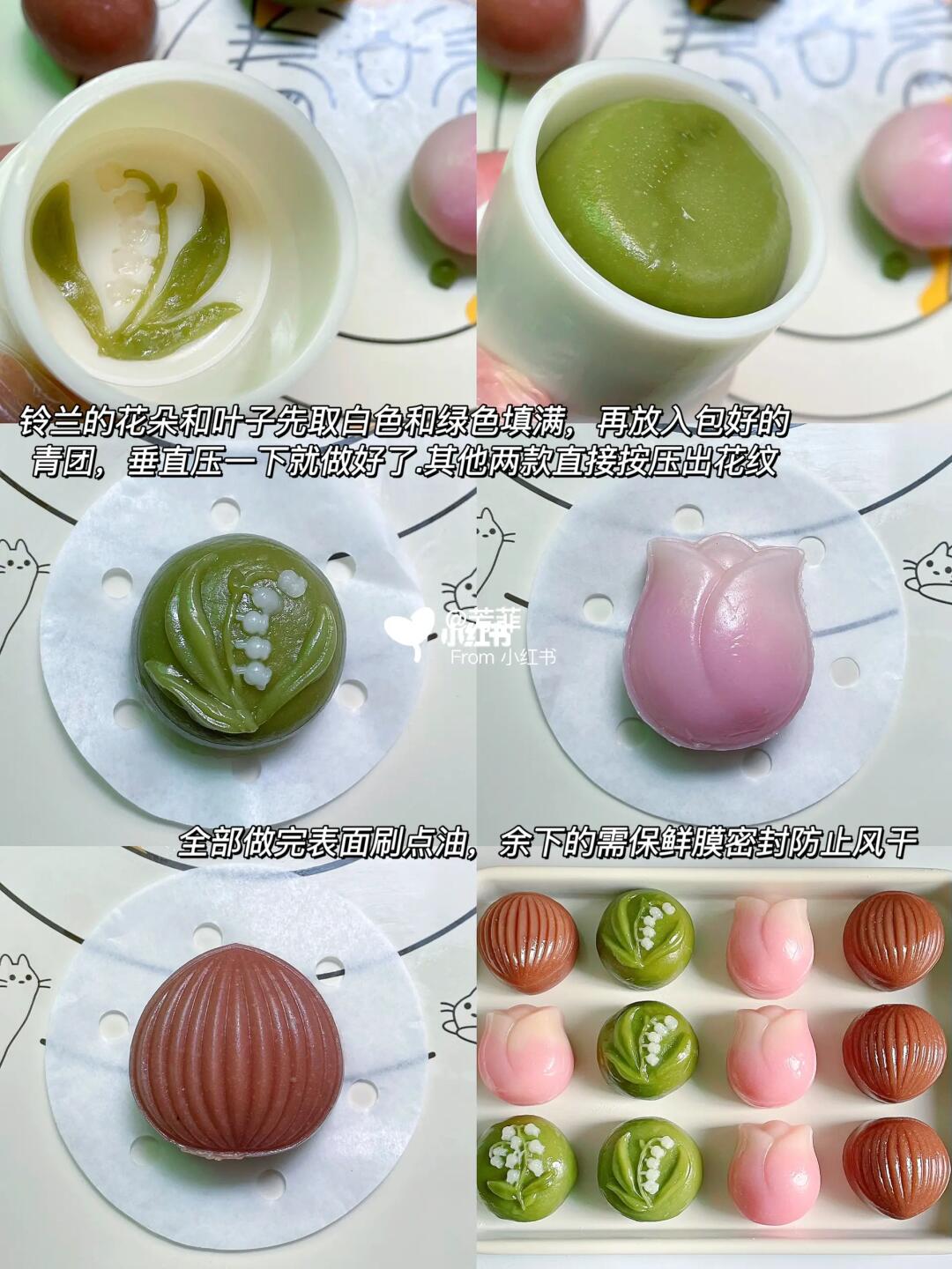 6️⃣青团皮用铃兰模具,先取少许白/绿皮将纹路填满,再放入包好的青团压模,很立体的铃兰造型就做好了~其余两款棕色用栗子模具,粉色用郁金香模具,压模后甚是生动太好看啦
