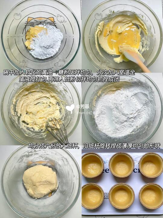 2️⃣筛入低粉切拌匀抓捏成团,均分成六份.放入纸杯沿纸杯捏成薄厚一致的塔皮形状