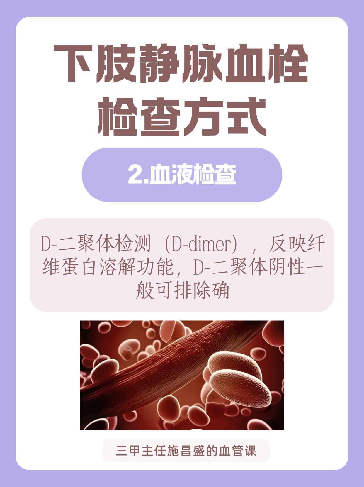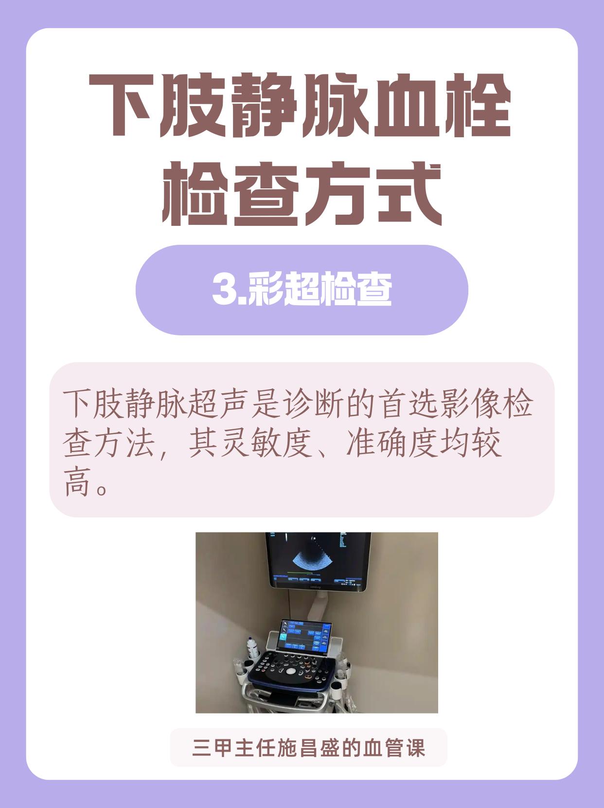 下肢静脉血栓检查方式。下肢静脉血栓咋检查?体格检查看下肢肿胀程度,血液检查测 D-二聚体,阴性可排除;彩超检查是首选影像方法,灵敏准确,广泛用于筛查监测。