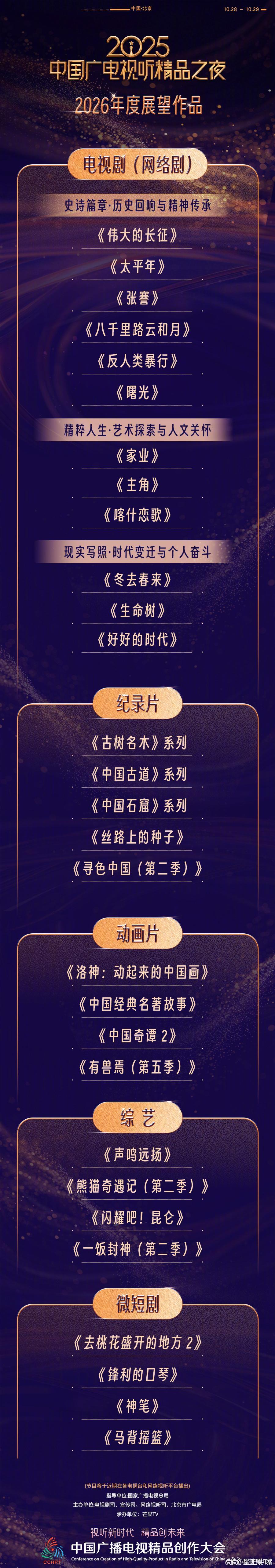 2025中国广播电视精品创作大会2025中国广电视听精品之夜“2026年度展望作品”大家期待哪部啊?包含剧集、综艺、微短剧、动画片、纪录片等等!