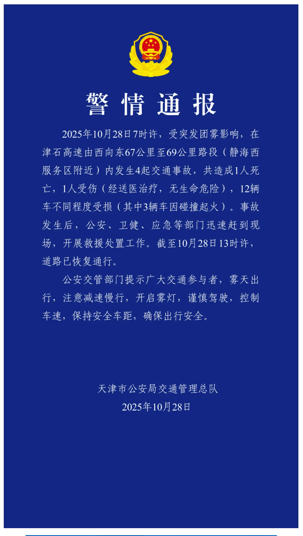 2025年10月28日7时许,受突发团雾影响,在津石高速由西向东67公里至69公里路段(静海西服务区附近)内发生4起交通事故,共造成1人死亡,1人受伤(经送医治疗,无生命危险),12辆车不同程度受损(其中3辆车因碰撞起火)。