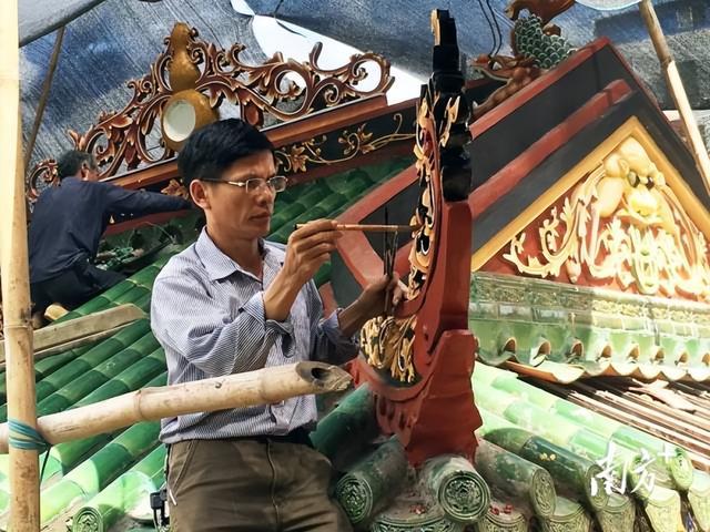 雷州灰塑非遗传承人在创作屋翘灰塑。