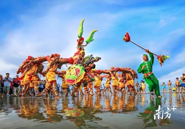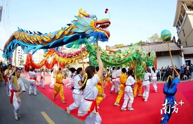 传承:生生不息的文化活力。湛江的“传承”,既有非遗文化的活态延续,也有竞技精神的代际传递,让古埠文化始终充满生命力。非遗从不是尘封的符号,而是流淌在街头巷尾的生活气息:东海岛人龙舞随潮起舞,数百人铸就的“龙身”在海风中翻腾;遂溪醒狮踩着铿锵鼓点跃上高桩,腾挪跳跃间尽显刚劲;吴川飘色演绎“东方隐蔽艺术”,让民间艺术惊艳世界;北坡游鱼点亮古今夜色,光影交织中诉说海洋文明的传承;湛江傩舞面具下的祈福仪式,将远古神秘与现代庆典完美融合;红土地上的石狗雕像,静默守护着岭南文化的独特记忆。竞技精神同样在这片热土上薪火相传:从全红婵对“水花消失术”的极致追求,到吴川草根足球队逆风翻盘的逆袭夺冠,从全运会武术散打选手的刚柔并济,到太极拳在街头巷尾的全民健身热潮……这些拼搏的身影,共同勾勒出湛江人“敢为人先、永不言弃”的精神图谱。