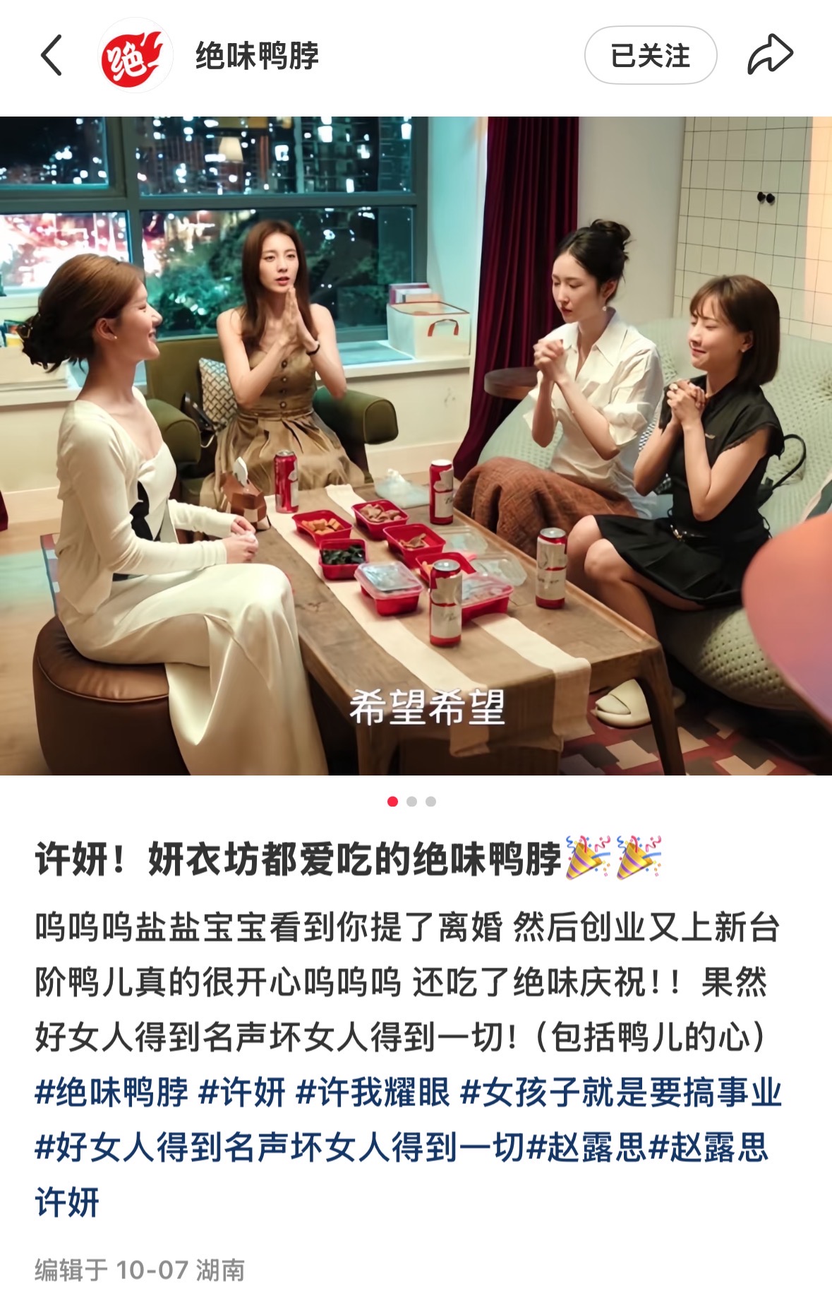 绝味鸭脖官方社交账号认领《许我耀眼》剧中产品。