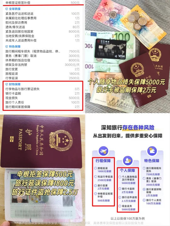 财物安全:随身物品损失保额5000元,银行卡盗刷保额2万,旅行证件盗抢保额2.5万