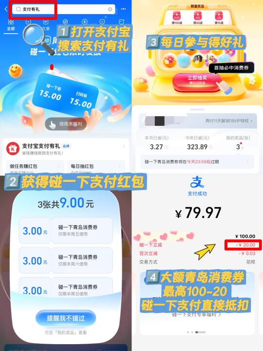 ✔️7月18日-20日17:00上支付宝搜索【支付有礼】领红包,还能抽大额青岛消费券,金额最高有100-20