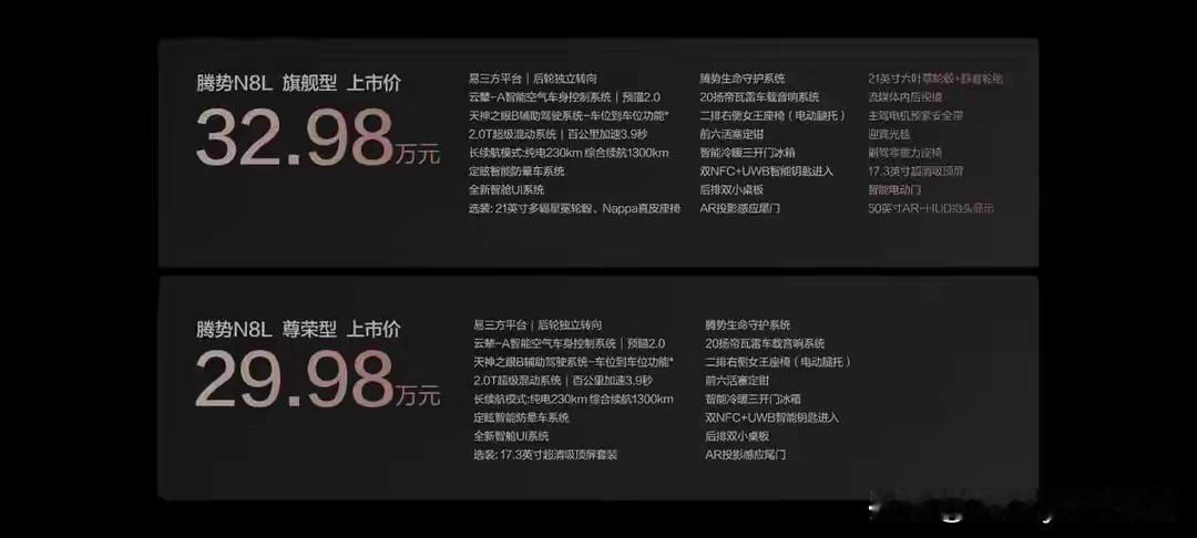 29.98万元起!车长5米2大6座、三电机、后轮转向、双腔空悬、天神之眼B(带激光雷达)腾势N8L这价格还有谁?