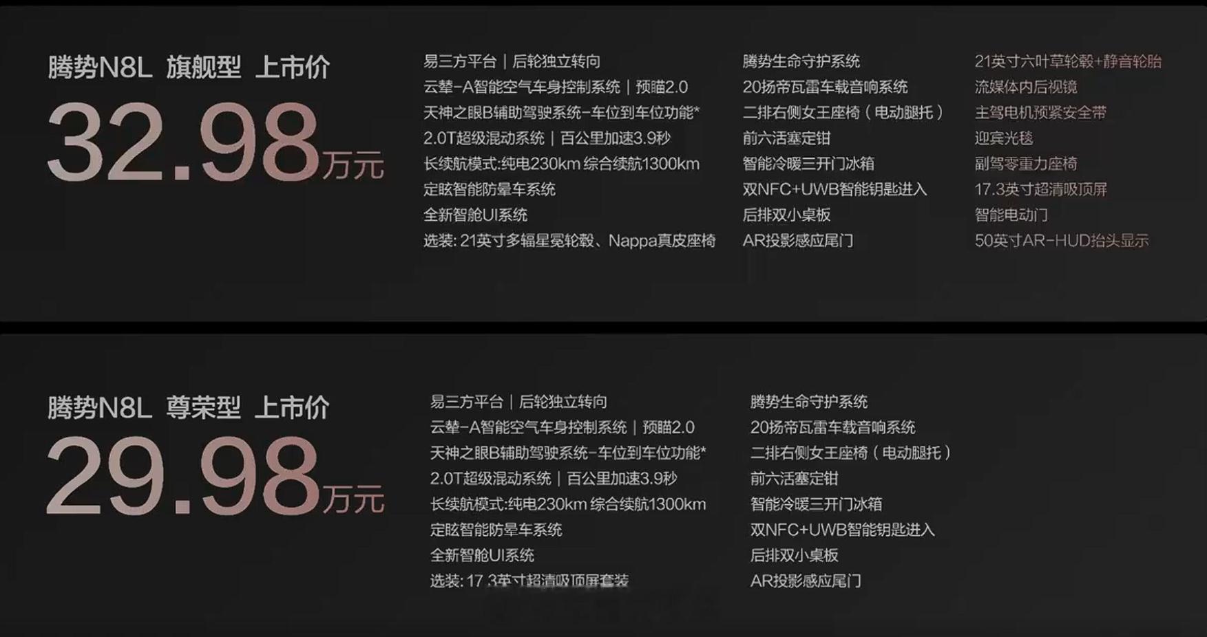 一台家人全票通过的车选一台让全家人都满意的车确实是个难题,无论是安全驾控、乘坐舒适,还是车内大空间都需要照顾到。10月28日上市的腾势N8L,以29.98万元-32.98万元的售价为家庭用户带来了一个均衡的选择。
