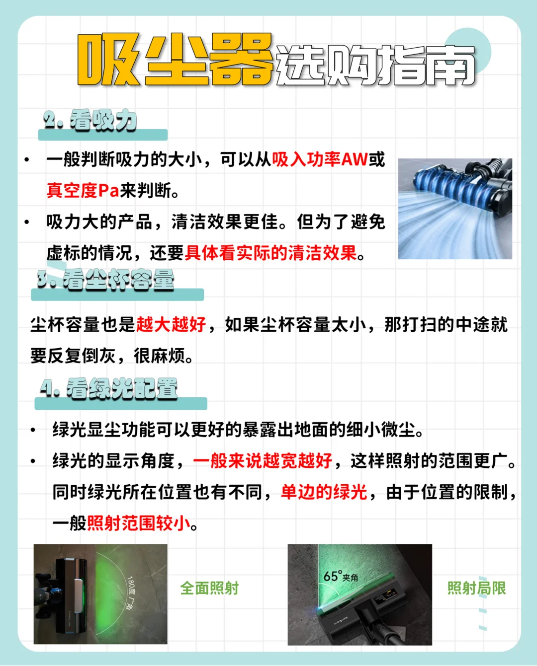 🔸一般来说吸力大的产品,清洁效果更佳,建议选择吸入功率200AW以上