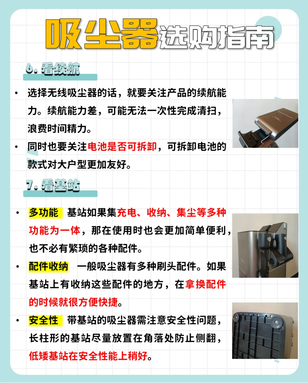 🔸带基站的吸尘器需注意安全性问题,长柱形的基站尽量放置在角落处防止侧翻,低矮基站在安全性能上稍好