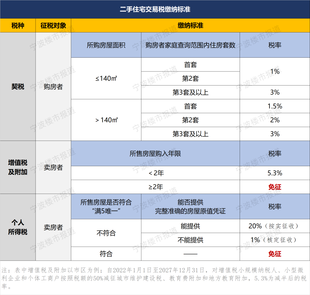 宁波现行最新的二手住宅交易税缴纳标准,是这样的: