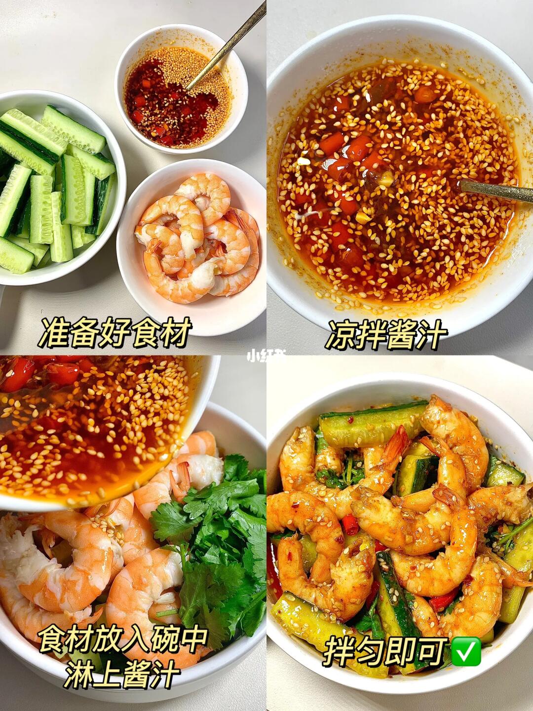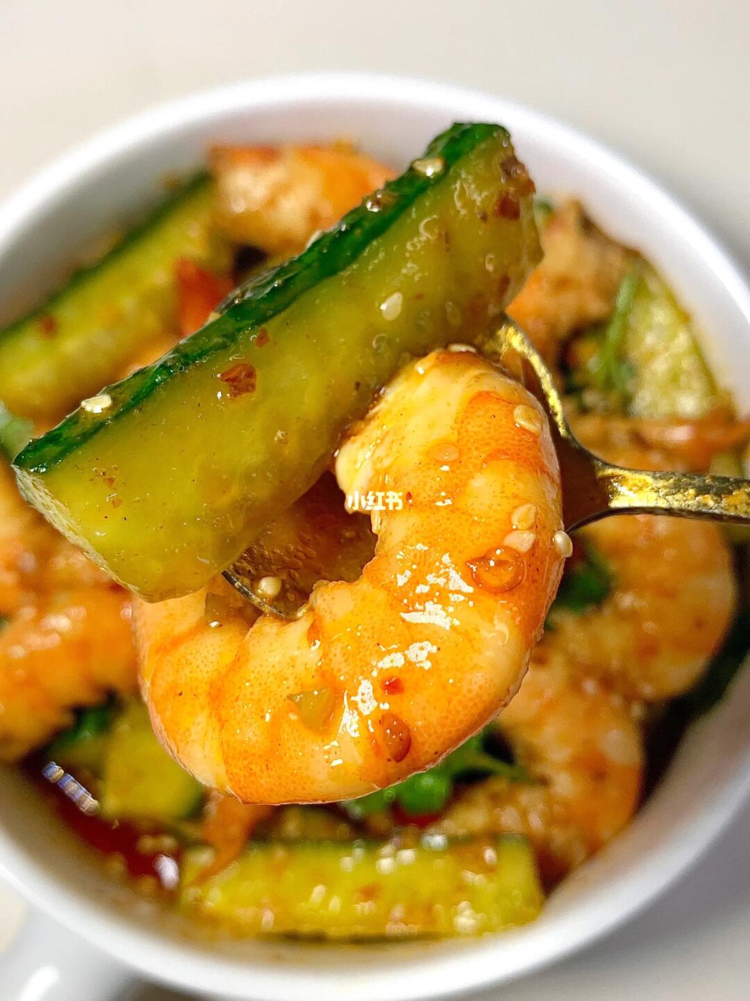 香辣爽口,低卡低脂,虾仁拌黄瓜! 真的好简单,喜欢的宝宝们快来试试吧👇🏻 [彩虹R]食材:虾仁 黄瓜 蒜未 [种草R]做法:水开下虾仁煮3分钟捞出去壳 拍黄瓜切成段 虾仁黄瓜装入碗中备用 [飞吻R]酱汁:碗中放小米辣+蒜未+白芝麻+辣椒面,淋上热油+一勺生抽+两勺陈醋+适量盐和白糖拌匀即可