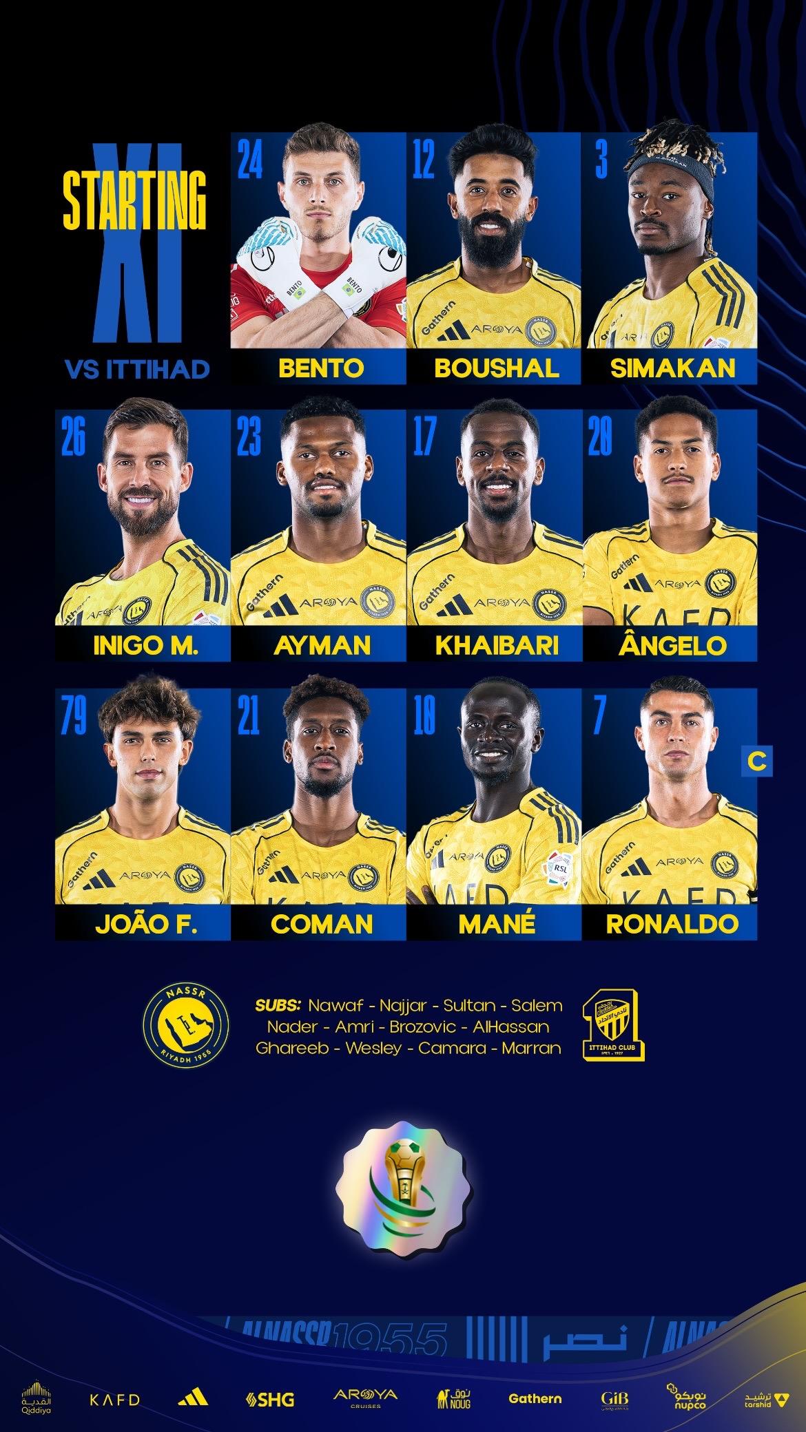 国王杯:胜利VS吉达联合首发,C罗领衔,马内、科曼出战