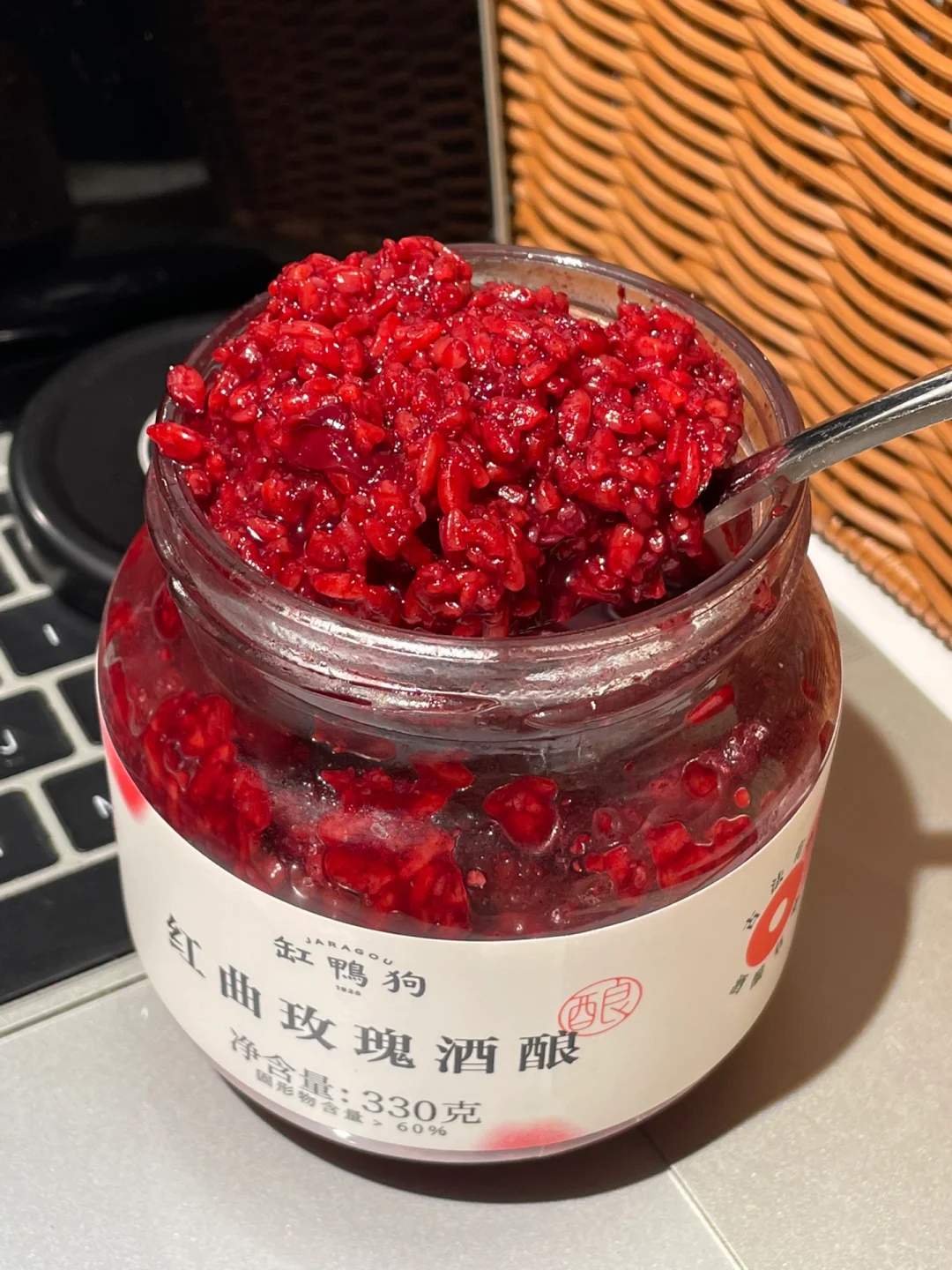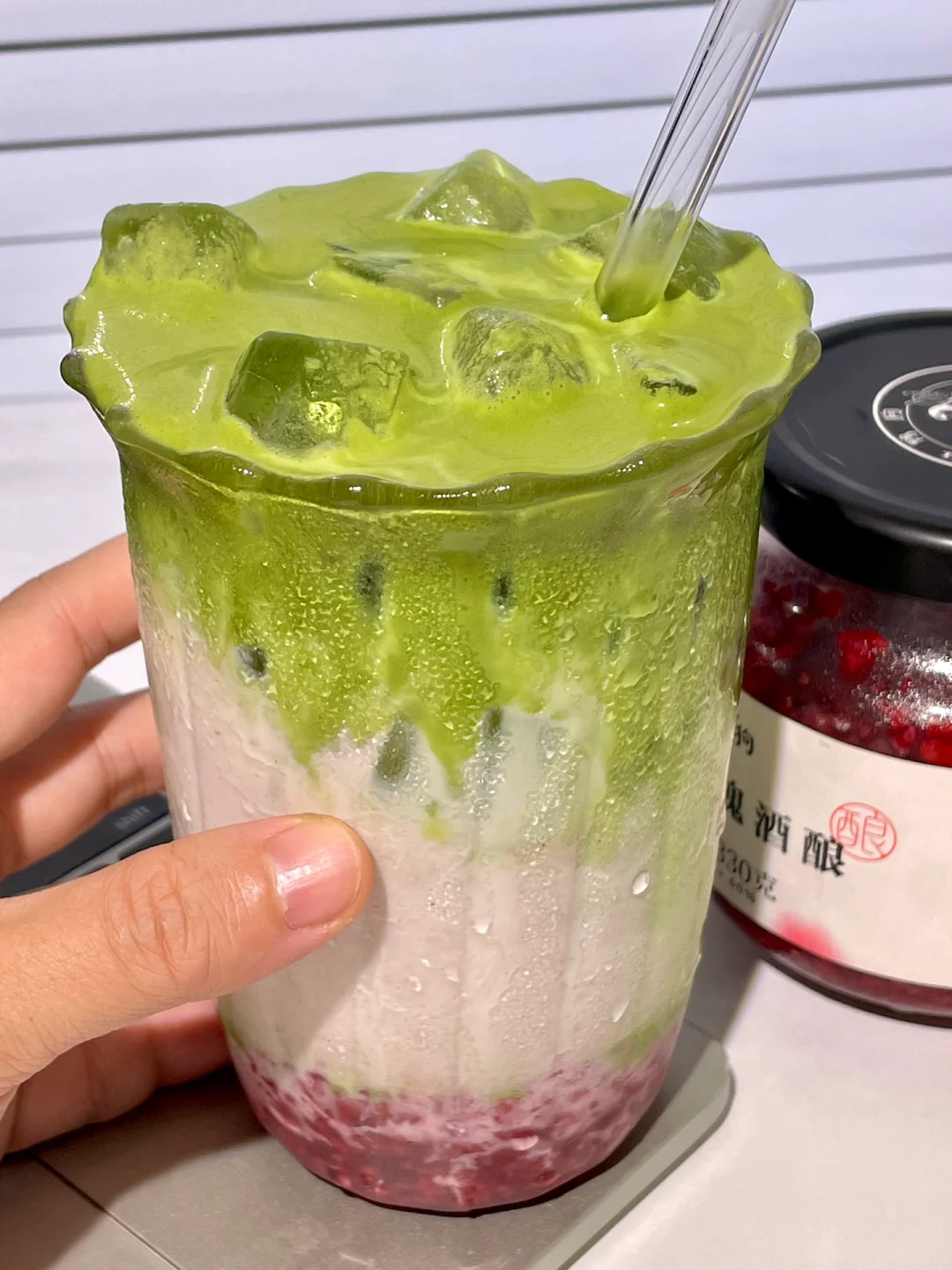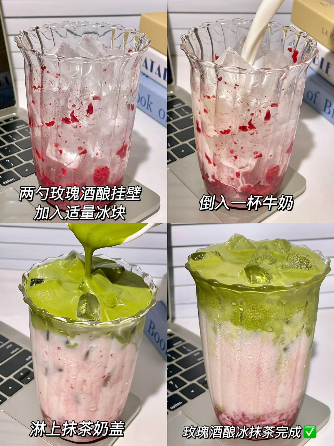 自己在家做的玫瑰酒酿冰抹茶好好喝!! 玫瑰酒酿➕牛奶➕抹茶奶盖 👉做法看图2⃣️ 花香混合酒香jujuju清爽😌 这不天气热了,来一杯太过瘾了!!